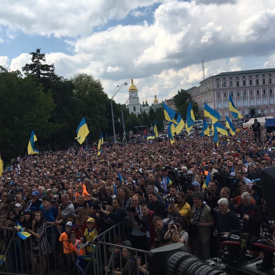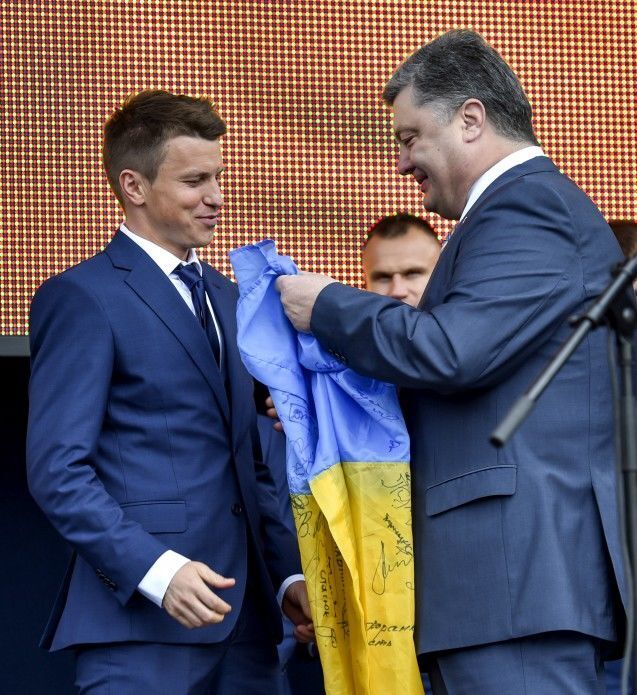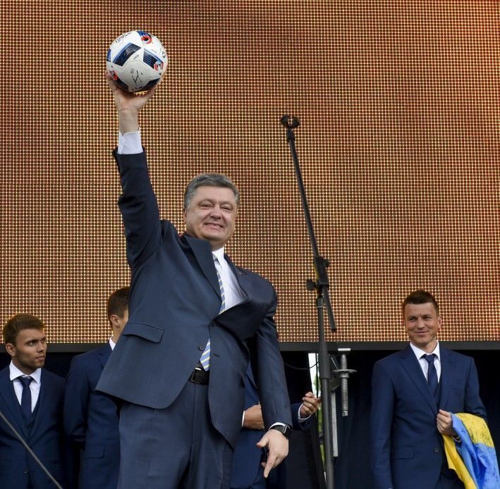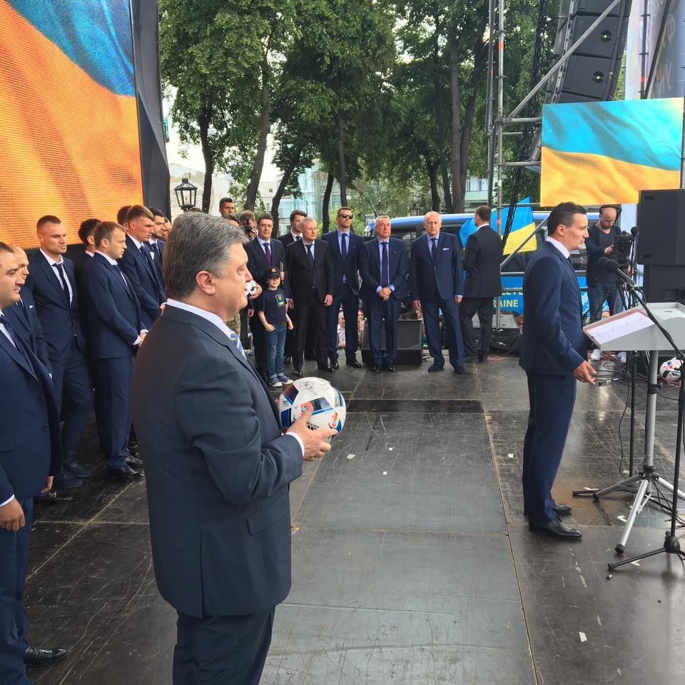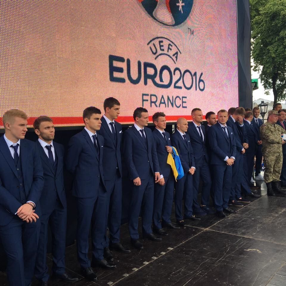 На Михайловской площади Киева прошла церемония проводов национальной сборной Украины по футболу, отправляющейся на чемпионат Европы во Францию. Несколько тысяч киевлян и гостей столицы пришли пожелать игрокам и тренерам удачи. Президент страны Петр Порошенко напомнил, что команда едет на Евро под "аккорды победительницы "Евровидения" Джамалы", и выразил надежду, что футболисты добьются такого же результата.