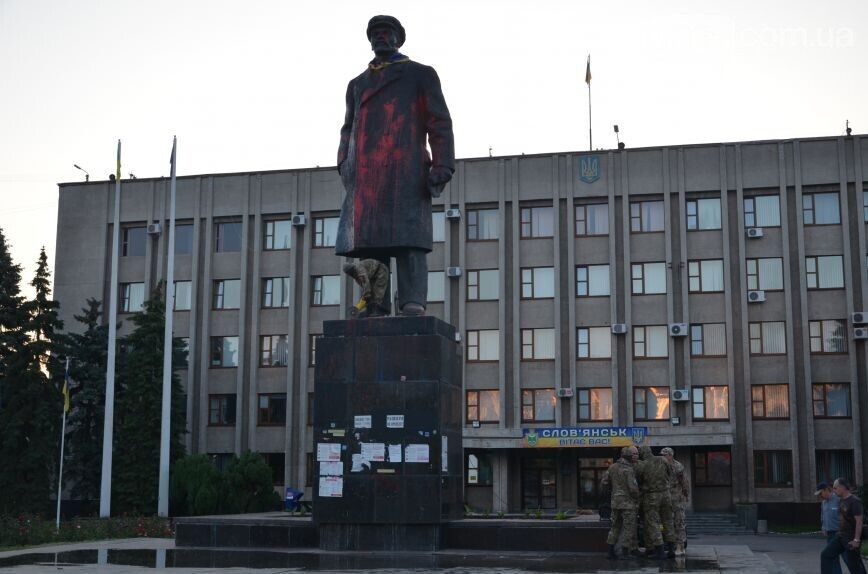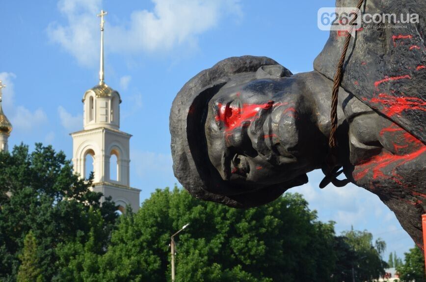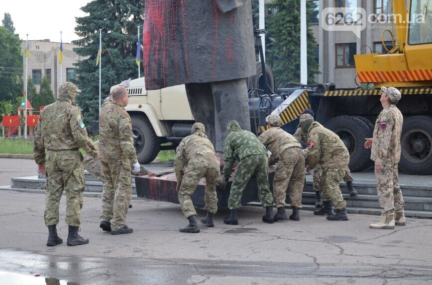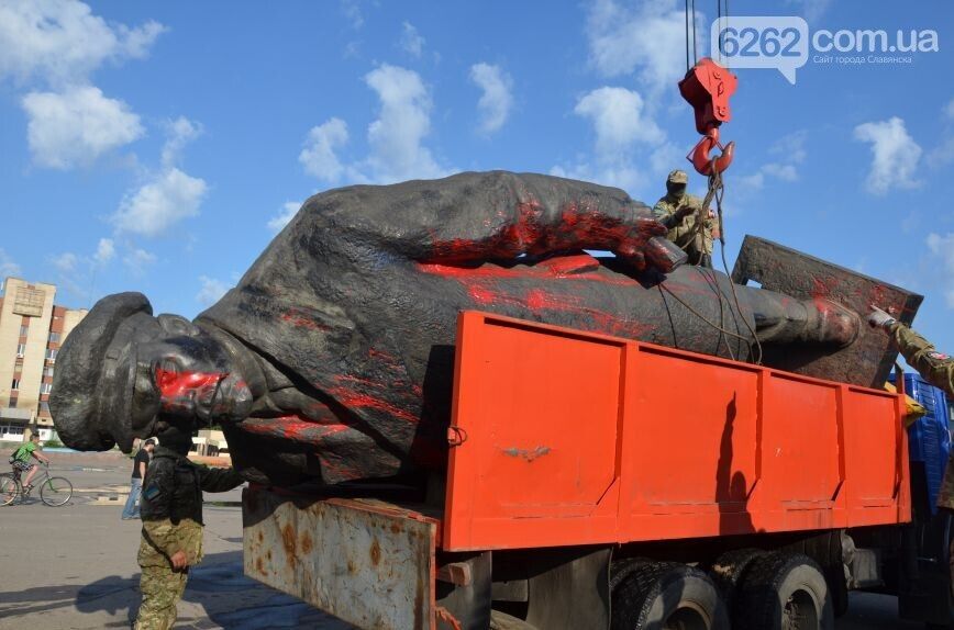Утром 3 июня в городе Славянск Донецкой области демонтировали памятник Ленину. Как сообщает сайт города, в 4 часа утра люди в камуфляже и с шевронами, похожими на шевроны "Правого сектора", отделили с помощью болгарок памятник от постамента и погрузили на грузовик. По словам заместителя городского головы Славянска Андрея Белозерова, памятник будет храниться на территории коммунального автотранспортного предприятия, пока на него не найдется покупатель.