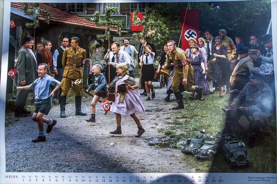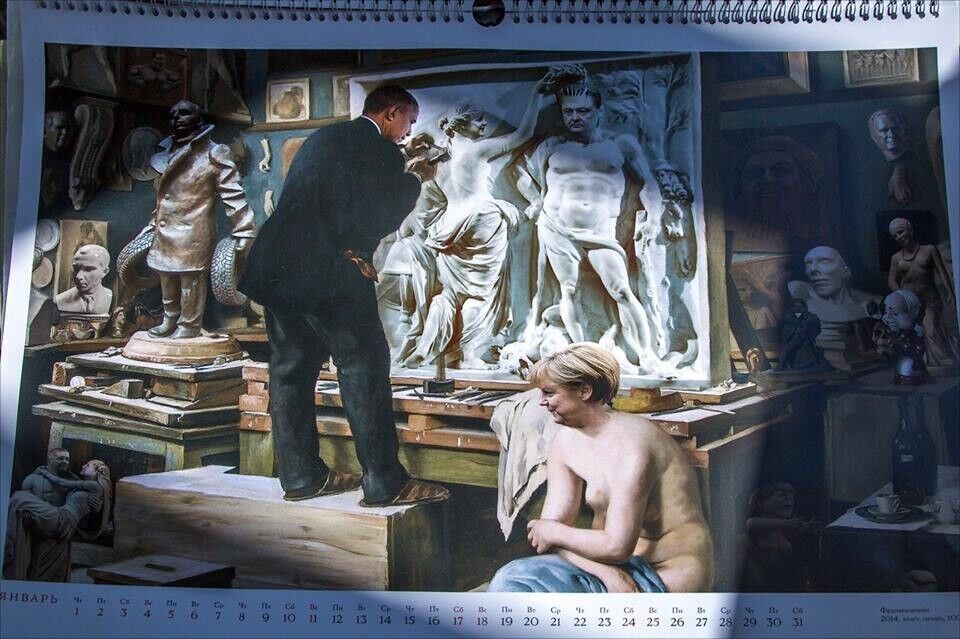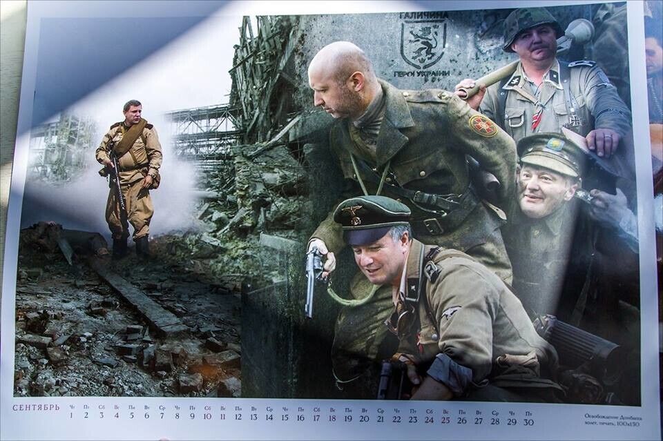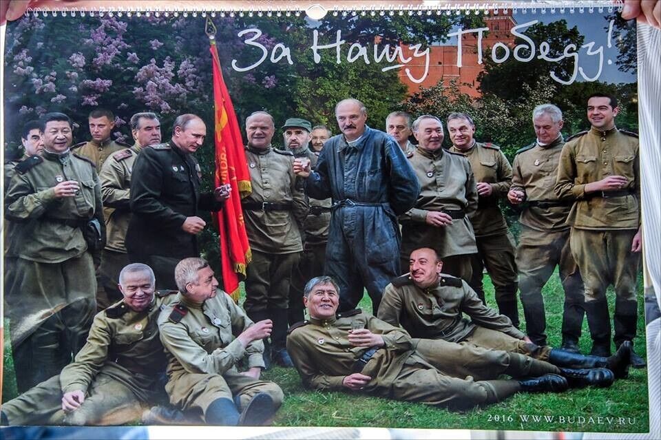 Пользователь Facebook Марта Туманова написала в своем сообщении, что приобрела в одном из московских аэропортов иллюстрированный календарь на 2016 год. На каждой его странице – вымышленный эпизод войны на востоке Украины. В виде боевиков так называемой Новороссии изображены Владимир Путин, Сергей Шойгу, Сергей Лавров и другие руководители России. Им противостоят Арсен Аваков, Александр Турчинов и другие украинские политики в форме с нацистской символикой. На рисунке с надписью "За нашу победу" Путин на фоне Кремля чокается стопкой с Александром Лукашенко, одетым в костюм механика-водителя. Автор иллюстраций, согласно подписи на календаре, – Андрей Будаев. Календарь, который автор сообщения назвала творением душевнобольных, продавался со скидкой – за 5000 рублей (1616 гривен).