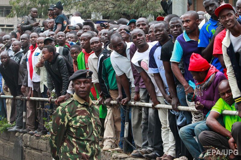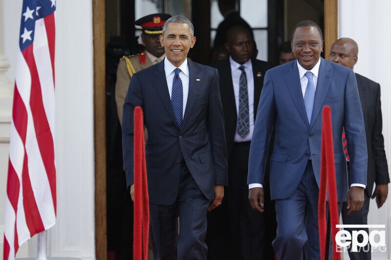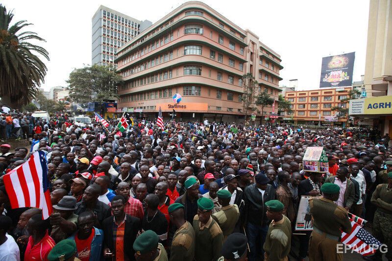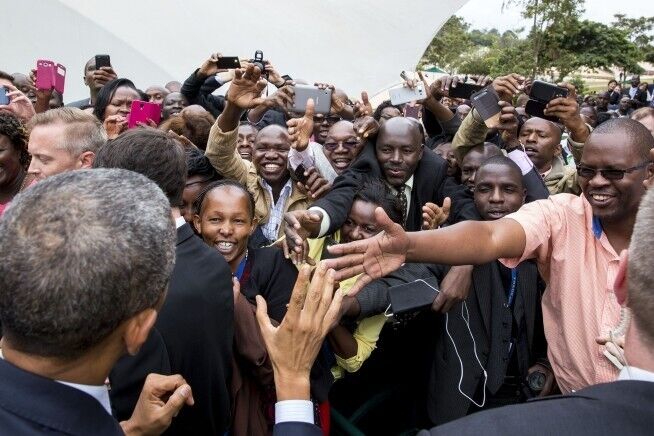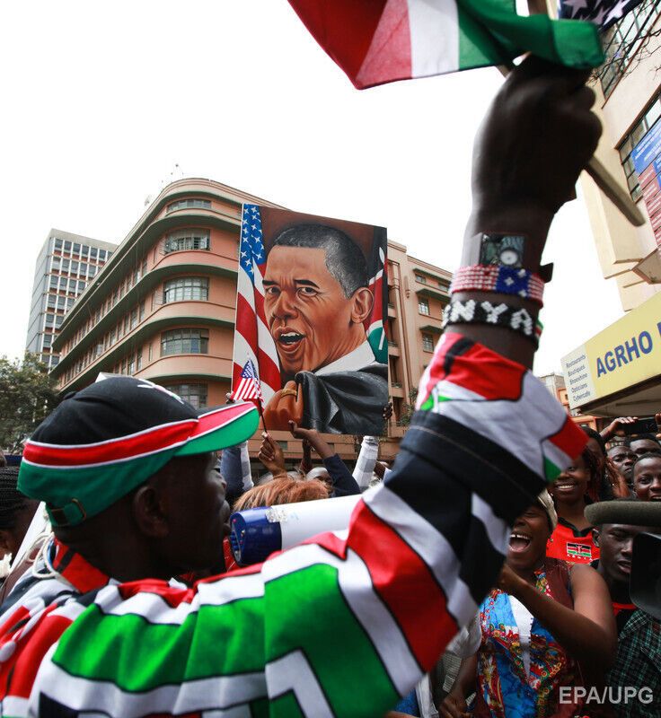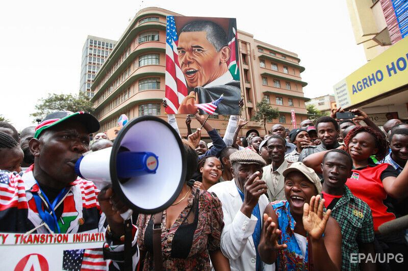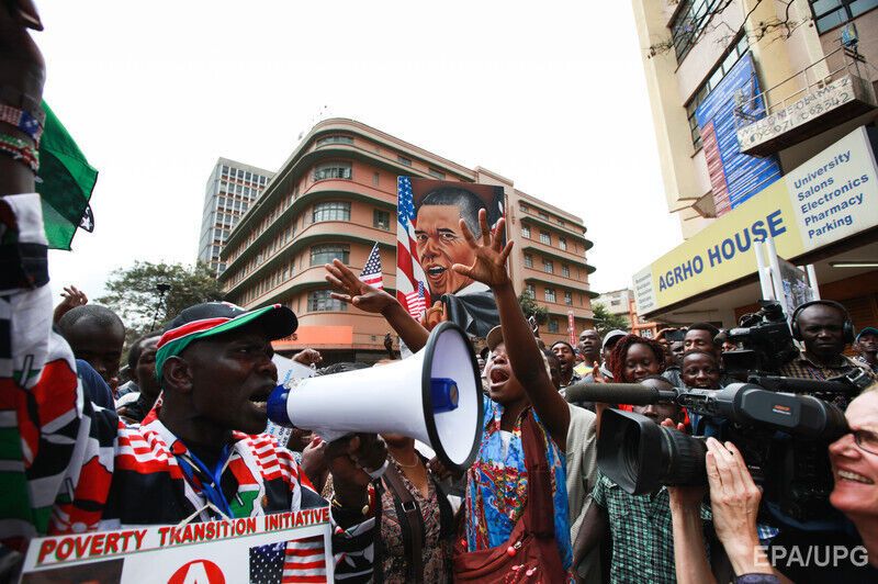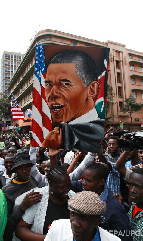 Местные жители собрались, чтобы поприветствовать Барака Обаму, который совершил свой первый визит в Кению, на Родину своего отца, в качестве президента США. В ходе двухдневного визита он провел переговоры с кенийским коллегой Ухуру Кеньяттой, а также отужинал со своими родственниками. Кроме того, американский лидер посетил "Мемориальный парк 7 августа" в Найроби, где возложил венок в память о погибших в результате бомбардировки посольства США в Найроби в 1998 году.