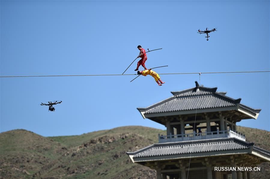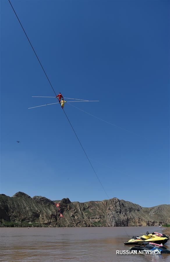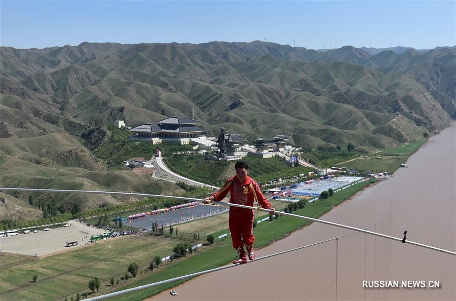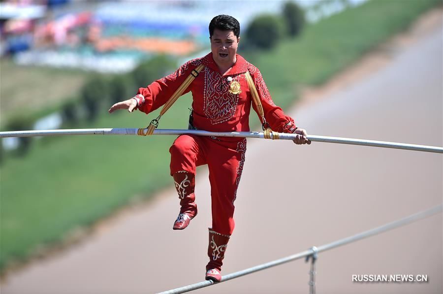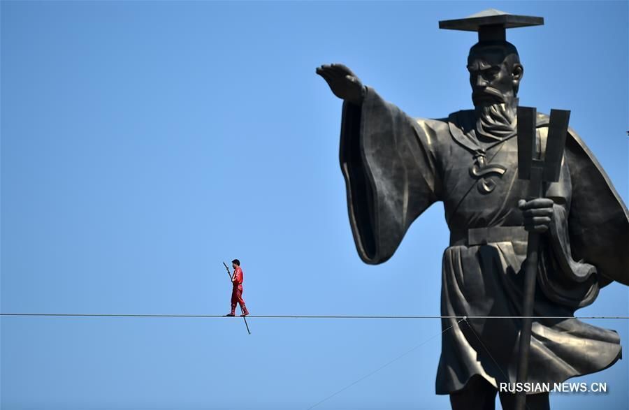 В Китае канатоходец установил рекорд хождения по стальному канату без страховки. Фоторепортаж