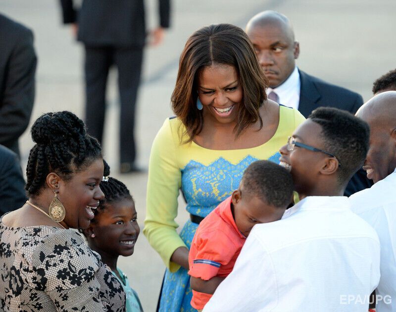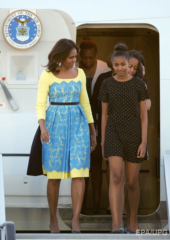 Супруга президента США с дочерьми прибыла в Великобританию с образовательным проектом. Его цель – обеспечить базовым образованием 62 миллиона девушек всего мира, у которых нет возможности посещать школу. Помимо этого, она встретится с младшим сыном принца Чарльза – Гарри и посетит одну из лондонских школ. С трапа самолета Обама сошла в платье цветов украинского флага.