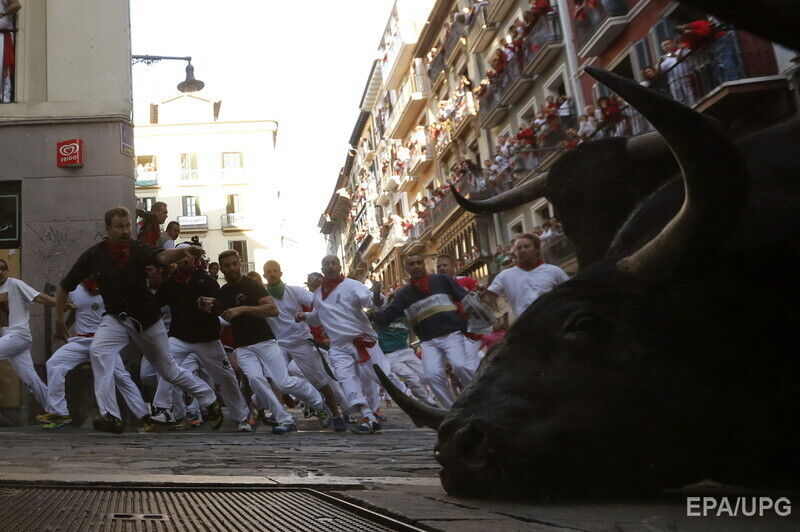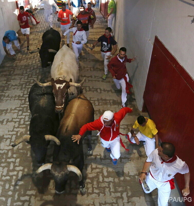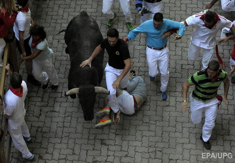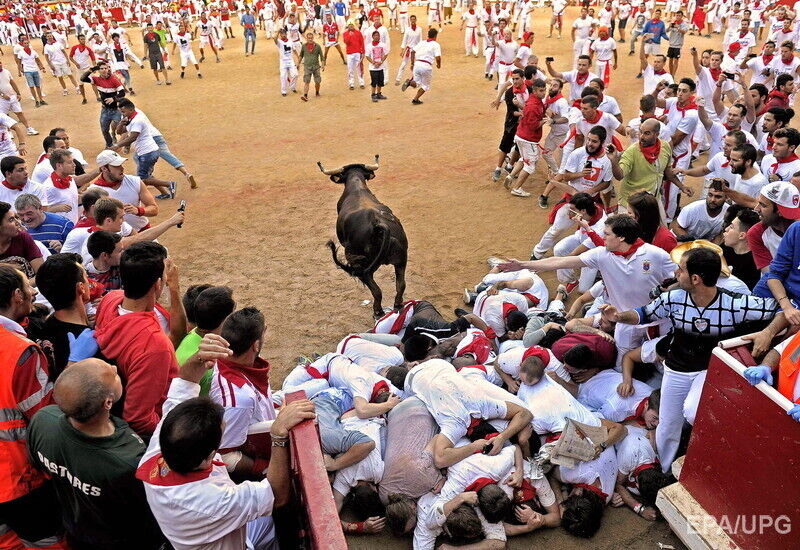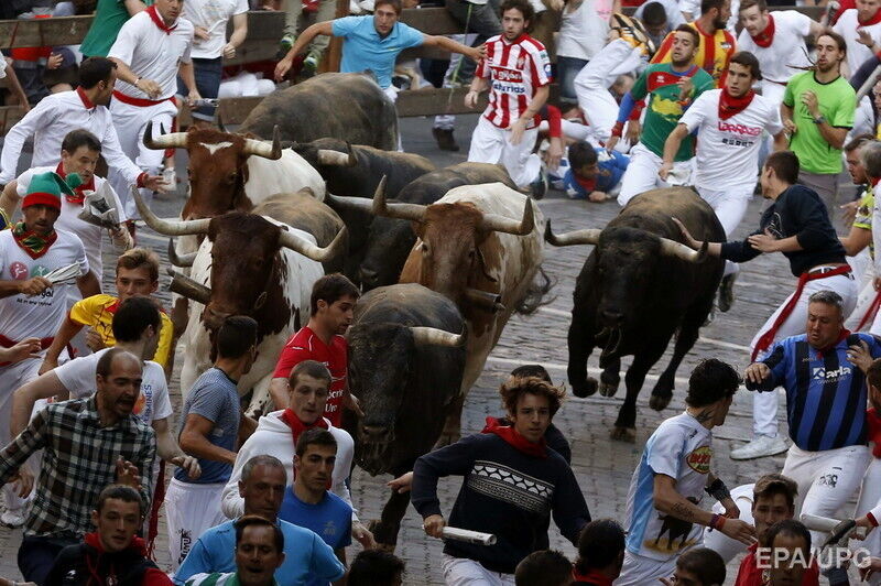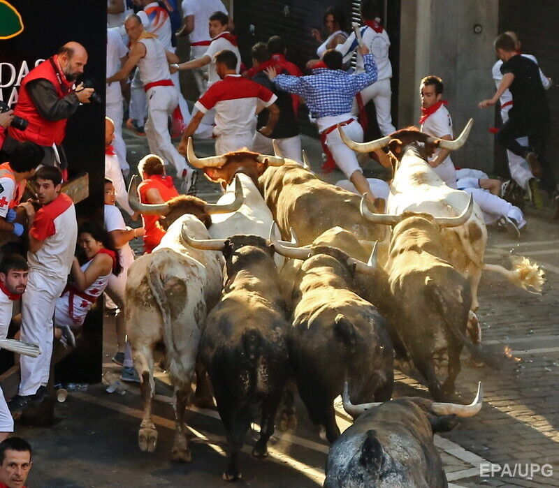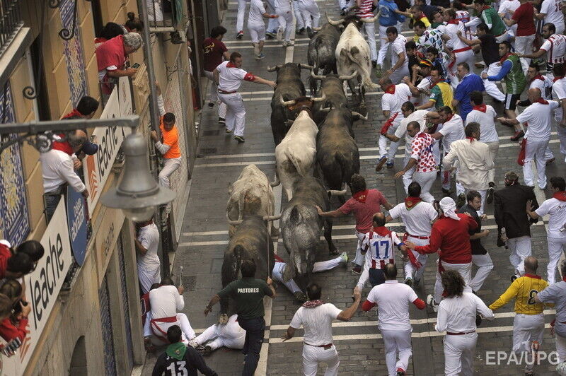 В последний день фестиваля "Сан-Фермин" в испанской Памплоне во вторник, 14 июля, в результате забега с быками по улицам города пострадали по меньшей мере шесть человек, сообщает Euronews. Пострадавших с травмами и ушибами доставили в больницы. При этом сообщается, что никто не получил колотых ран рогами быка. Забег с быками по улицам города длился чуть более двух минут. В действе приняли участие несколько сотен смельчаков.