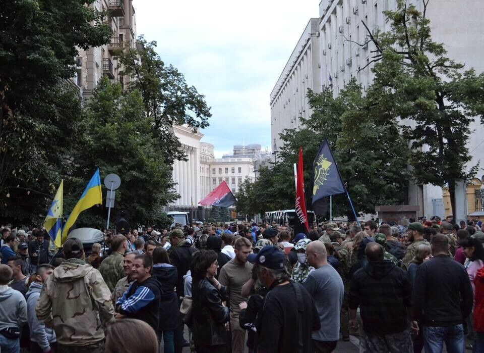 Под Администрацией Президента собрались на митинг представители националистических организаций. Об этом сообщил в Facebook журналист Дмитрий Гнап. "Правый сектор под АП сейчас. Человек 250. Немного. Чего собрались, мало кто понимает. Лозунги от "Революция!" до "Украина для украинцев", – написал он. По словам очевидцев, митингующие требуют отставки главы МВД Арсена Авакова. В то же время, как сообщает "Укринформ", организаторы призвали участников собрания не провоцировать представителей МВД и Нацгвардии, присутствующих на Банковой. Во время брифинга возле Администрации Президента пресс-секретарь "Правого сектора" Артем Скоропадский заявил, что националисты, в отличие от власти, держат свое слово, которое они давали относительно защиты Родины и проведения люстрации. "Мы всегда придерживаемся наших обязательств. Все националисты: батальон ОУН, "Правый сектор", "Черный комитет", – держат слово относительно защиты Родины. Мы говорили, что будем защищать Родину, – мы защищаем. Мы говорили, что будем проводить "мусорные люстрации", – мы их делаем", – отметил Скоропадский. Власть же, по его словам, "не люстрировала ни одного преступного чиновника".