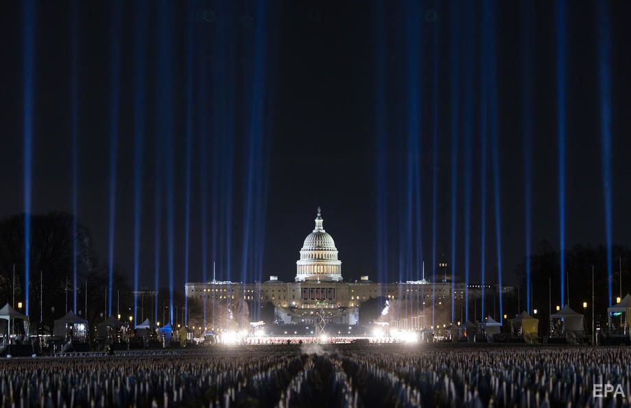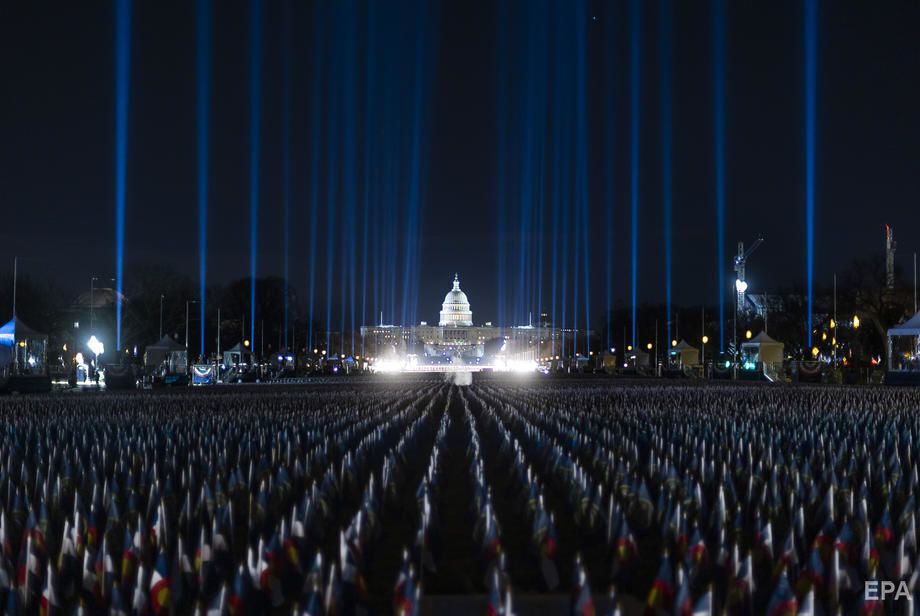 В преддверии инаугурации избранного президента США Джо Байдена, которая состоится 20 января, в Вашингтоне на аллее перед Капитолием установили около 200 тыс. флагов, сообщил канал NBC Washington 18 января. Они символизируют американцев, которые не смогли приехать в Вашингтон на инаугурацию из-за пандемии коронавируса и угроз безопасности. "Поле флагов" также осветлили 56 световыми столбами, которые символизируют 50 штатов и шесть территорий США. Столбы загорелись на 46 секунд – в честь 46-го президента США Джо Байдена. Фото опубликовало агентство EPA.