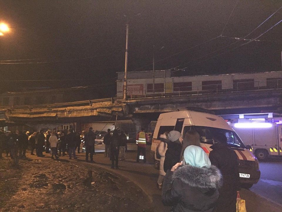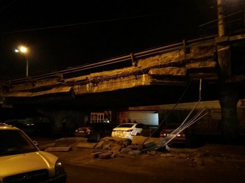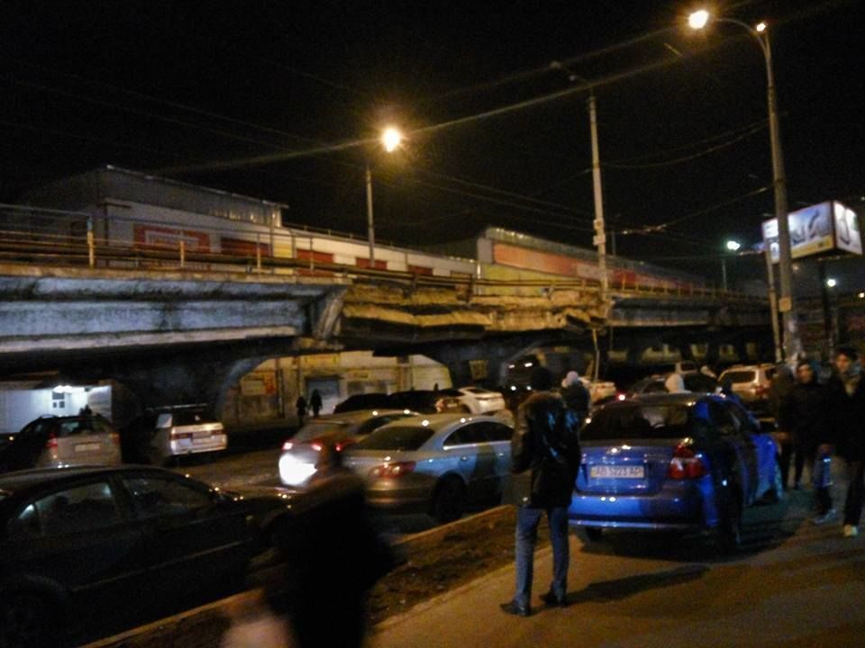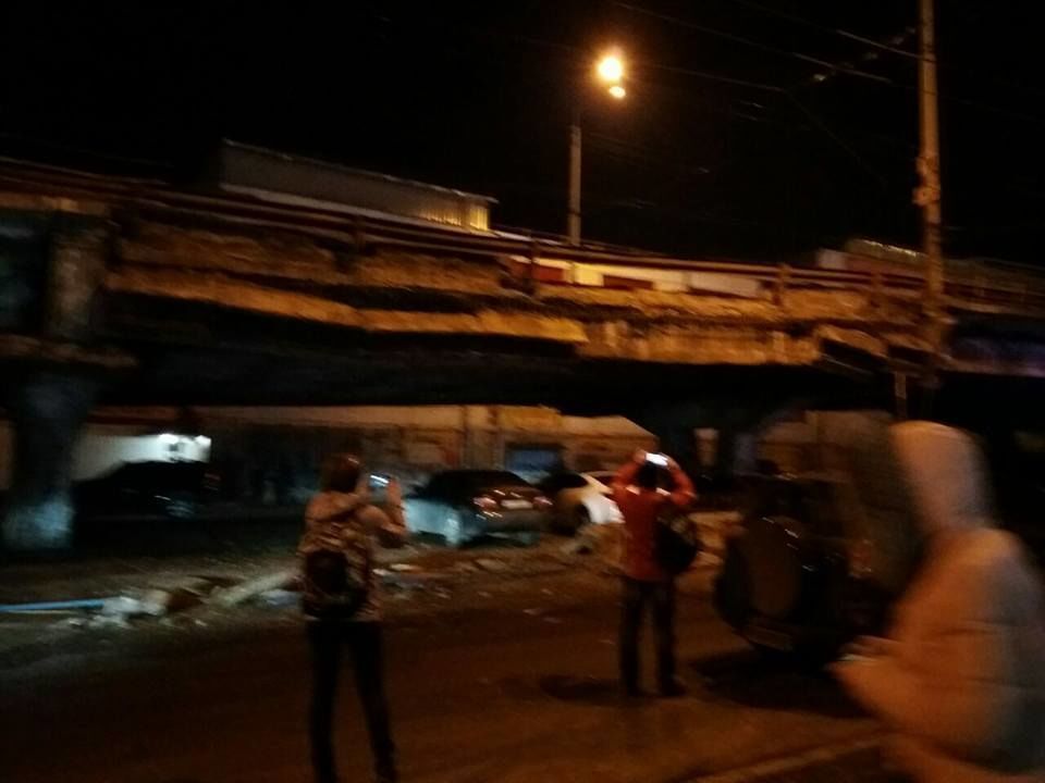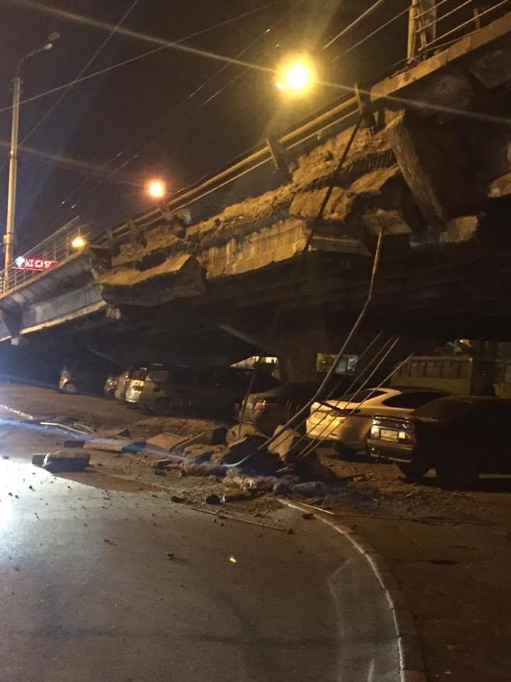 Пользователи соцсетей опубликовали фотографии с места обрушения моста на Шулявском путепроводе в Киеве, в результате чего на одной из важных транспортных артерий столицы было перекрыто движение. На место происшествия приехали скорая помощь, полиция и спасатели. Обломки моста падали возле припаркованных поблизости автомобилей. О пострадавших в результате происшествия не сообщается. Отмечается, что по частично разрушенному мосту без происшествий смогла проехать пожарная машина.