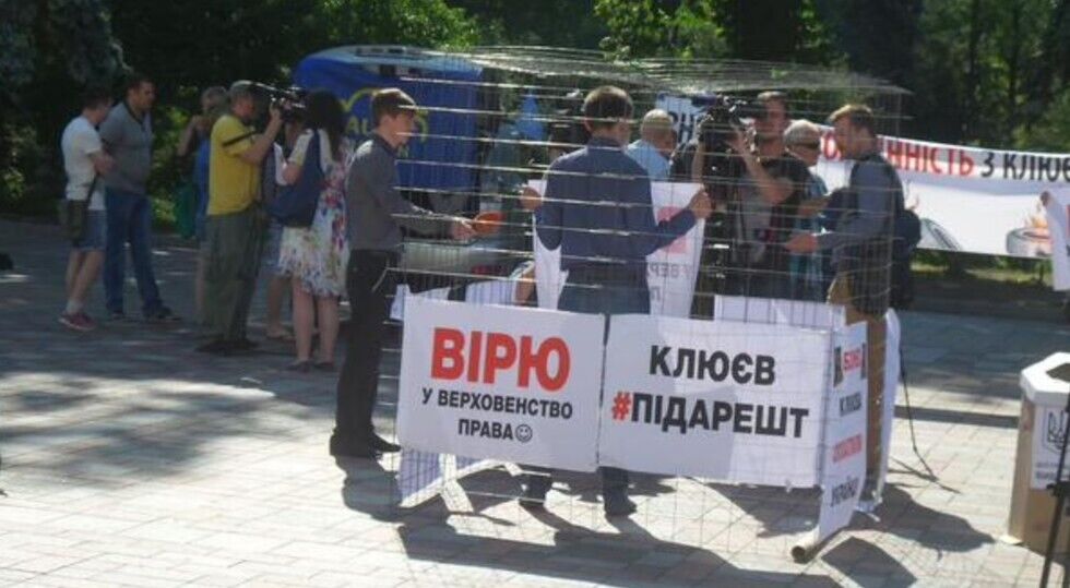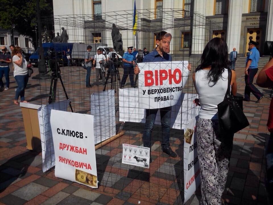 Во вторник, 2 июня, под зданием Верховной Рады Украины несколько десятков активистов требуют снять депутатскую неприкосновенность с внефракционного народного депутата Сергея Клюева. Перед парламентом митингующие установили клетку, в которую посадили активиста в маске с лицом Клюева. Глава правления "Центра противодействия коррупции" Виталий Шабунин заявил журналистам, что активисты хотят, чтобы деньги Клюева, "украденные у народа, были народу возвращены". "Чтобы его активы были арестованы, ему нужно предъявить подозрение. Но этого нельзя сделать, если у него есть депутатская неприкосновенность", – сказал он.