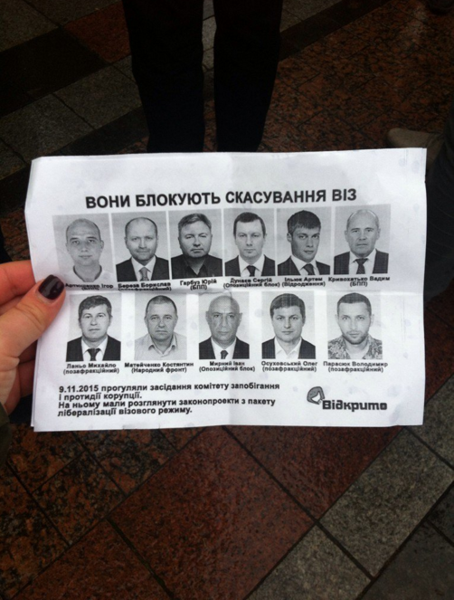 В Киеве под зданием парламента проходит акция в поддержку "безвизового пакета" законопроектов, которые сегодня рассматривает Верховная Рада. Активисты держат в руках плакаты с лозунгами и номерами законопроектов, зарегистрированных в парламенте. Некоторые участники распечатали листовки с именами и фотографиями 11 депутатов – членов комитета по борьбе с коррупцией, которые не явились на его заседание 9 ноября и не участвовали в обсуждении законопроектов. Сегодня, 10 ноября, Верховная Рада рассмотрит шесть законопроектов, которые необходимы для либерализации визового режима с ЕС. 15 декабря Еврокомиссия оценит достигнутый Украиной прогресс на пути выполнения Плана действий и представит соответствующие рекомендации.