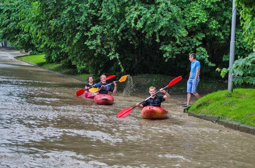 После сильного дождя река Полтва вышла из берегов, и Львов затопило. Некоторые львовяне передвигаются по городу на каноэ. На улицах образовались настоящие реки, и люди в течение нескольких часов вообще не могли выйти из зданий. Сейчас движение по городу затруднено из-за поваленных деревьев.