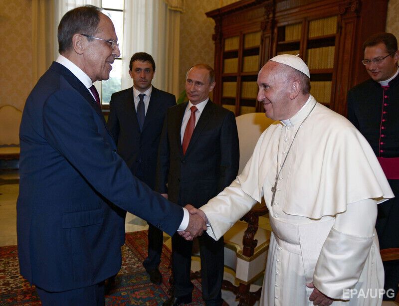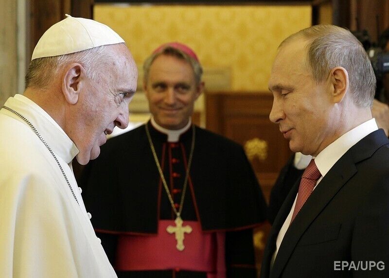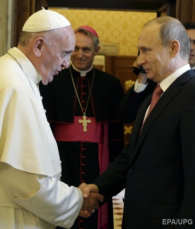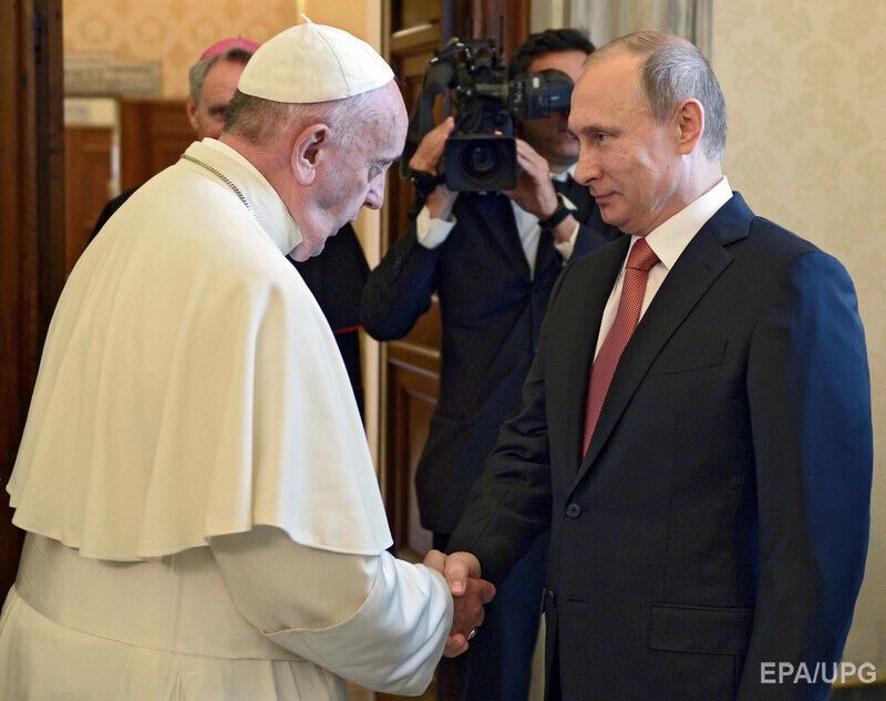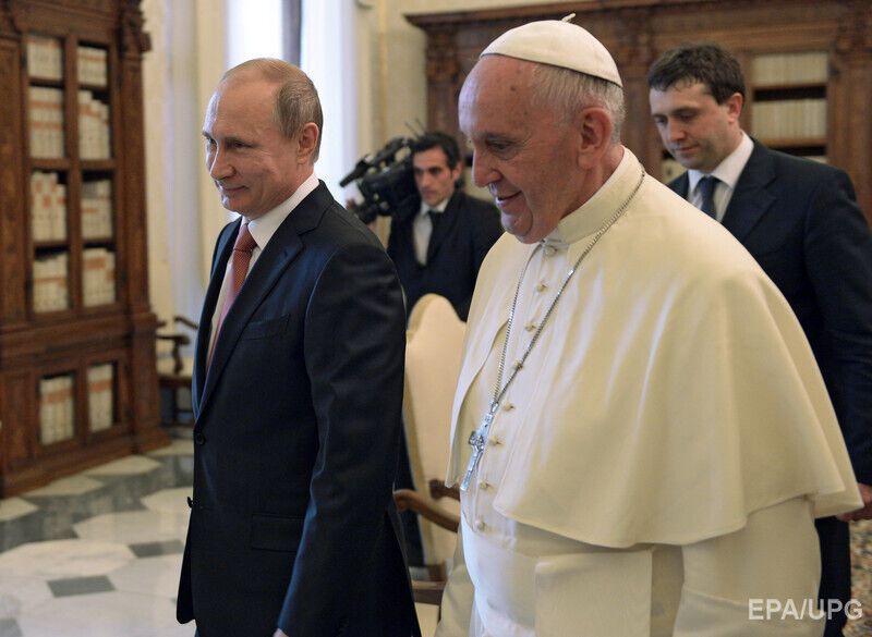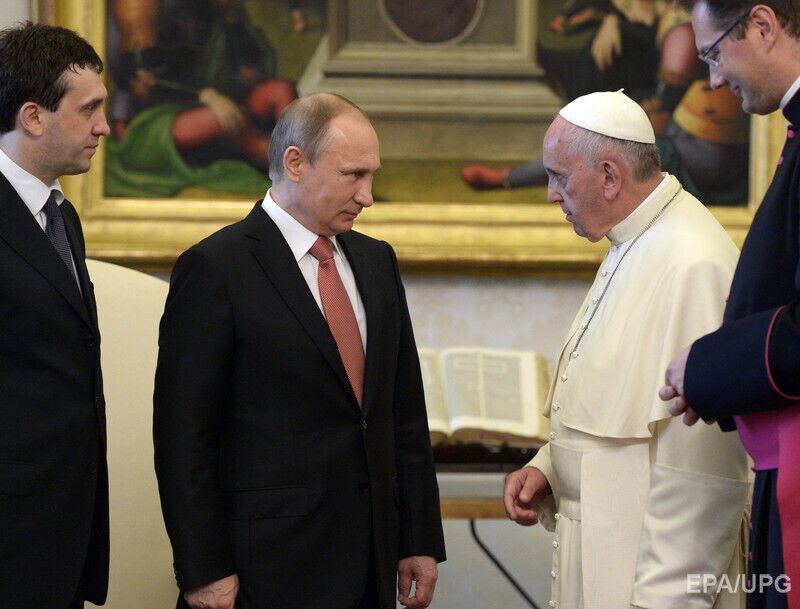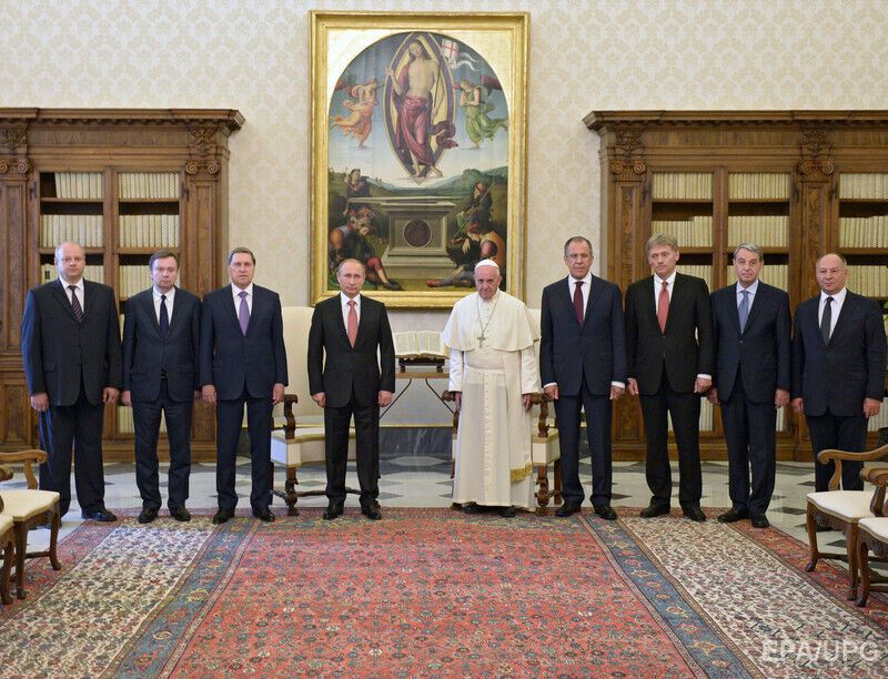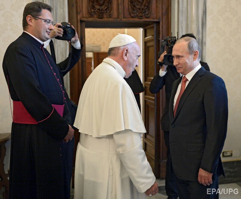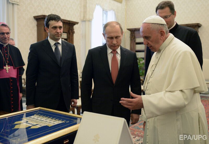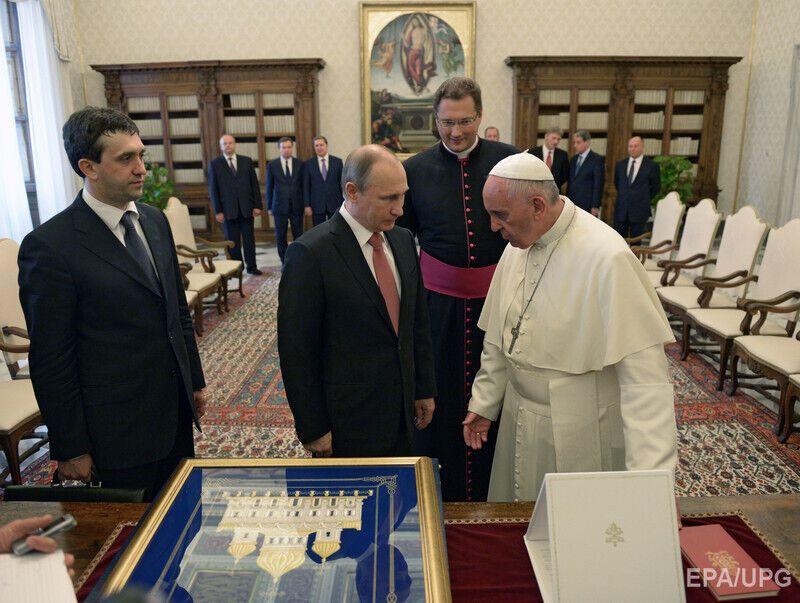 Президент РФ Владимир Путин провел беседу с Папой Римским Франциском I за закрытыми дверями. На прощание Папа подарил Путину медаль с изображением ангела-миротворца. "Эта медаль, которая была произведена художником прошлого века, изображает ангела, который приносит и мир, и справедливость, и солидарность, и защищает. А также этот текст, в котором есть размышления о том, что Евангелие нам приносит свет в жизнь, и радость, и там есть геополитические размышления и о нас, и о нашей жизни", – сказал понтифик президенту.