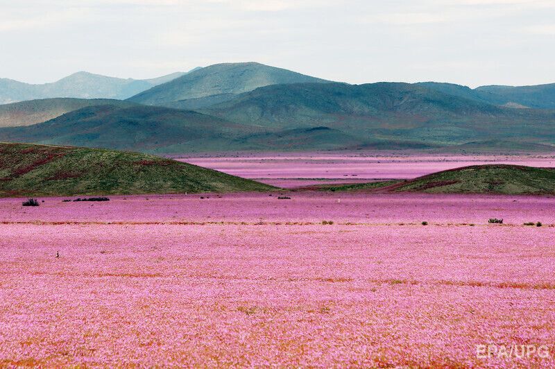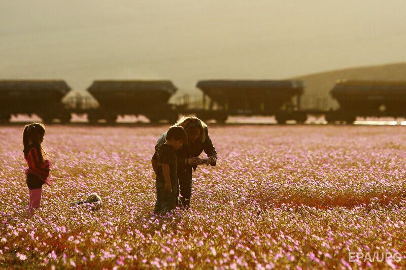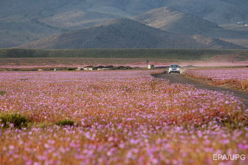После сильных осадков в начале октября одно из самых засушливых мест на планете, пустыня Атакама на севере Чили, покрылось буйной растительностью. Дождя в этой местности не было семь лет, а в последний раз подобный ковер из цветов появлялся в пустыне 18 лет назад. Цветущая Атакама привлекает тысячи туристов. По прогнозу экспертов, уже в ноябре растительность исчезнет и пейзаж станет, как обычно, безжизненным.