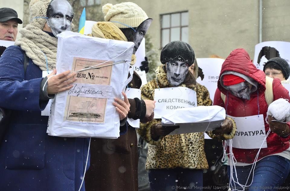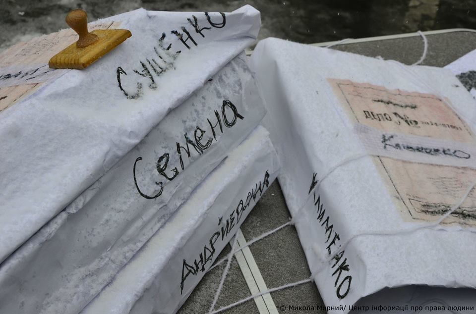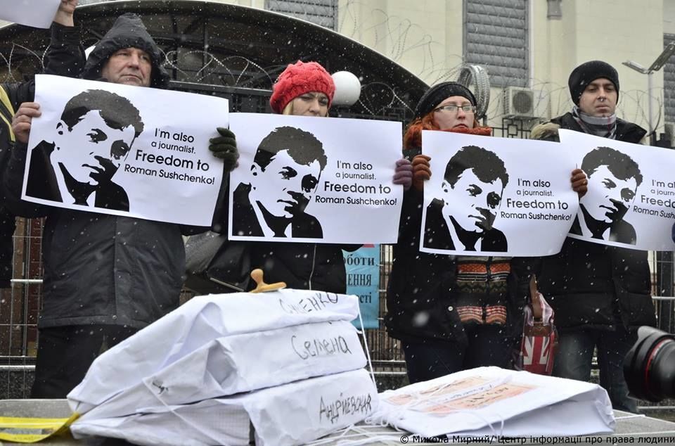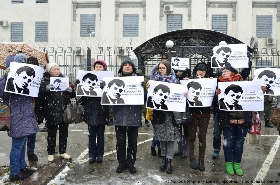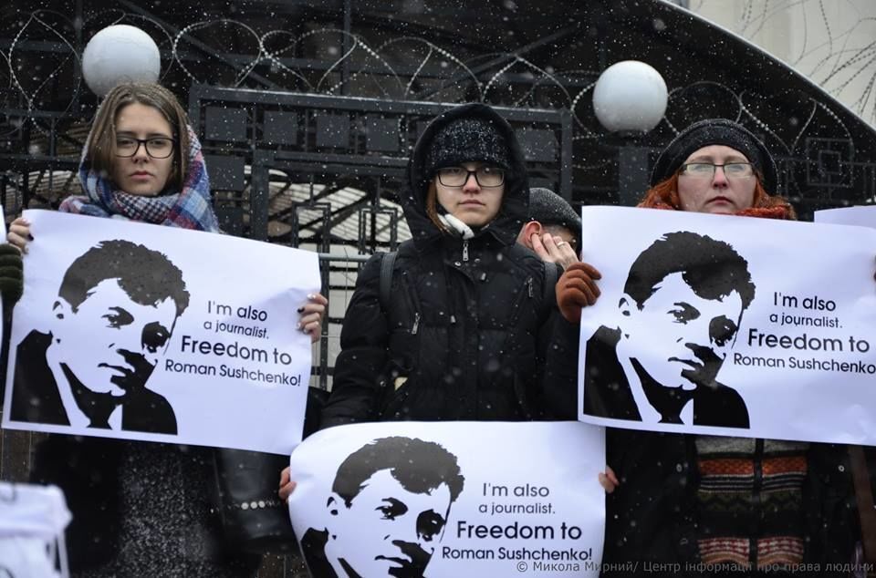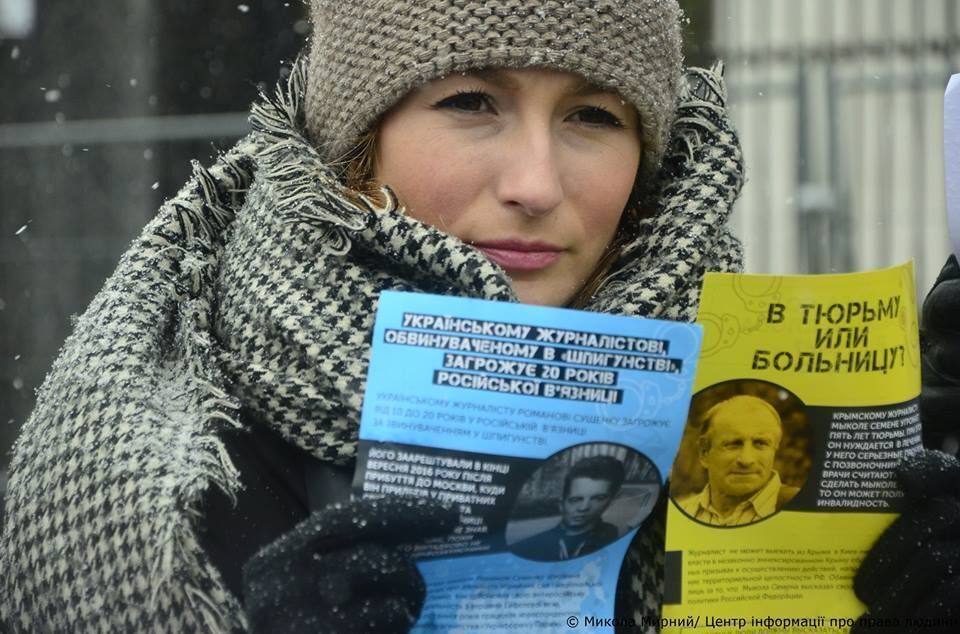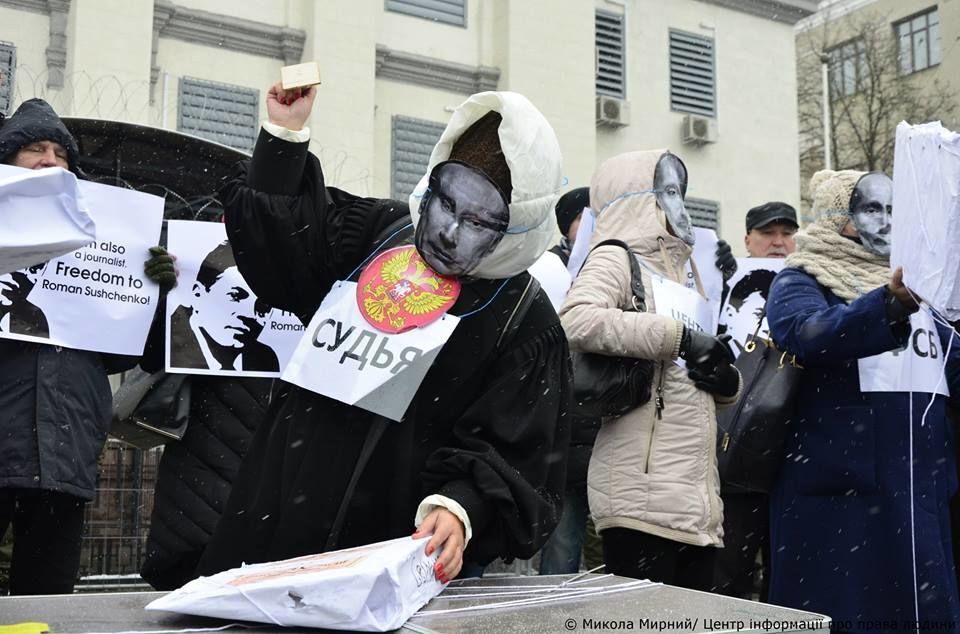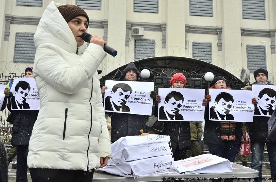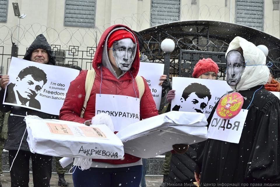 Сегодня у посольства РФ в Киеве состоялась акция-перформанс "Россия поставила на конвейер расправы над украинскими журналистами" в поддержку сотрудников украинских СМИ, которые стали политзаключенными в РФ, сообщает Центр информации о правах человека в Facebook. Акция приурочена к Международному дню борьбы с безнаказанностью за преступления против журналистов. Ее организовали Центр информации о правах человека и Центр гражданских свобод. Участники потребовали освободить украинских журналистов Романа Сущенко, Николая Семену и других.