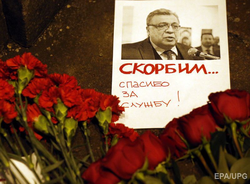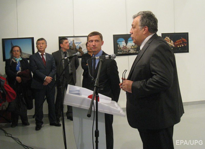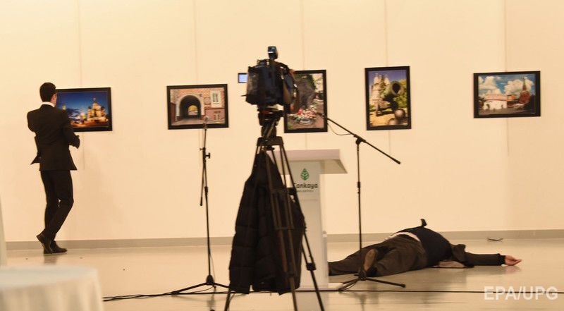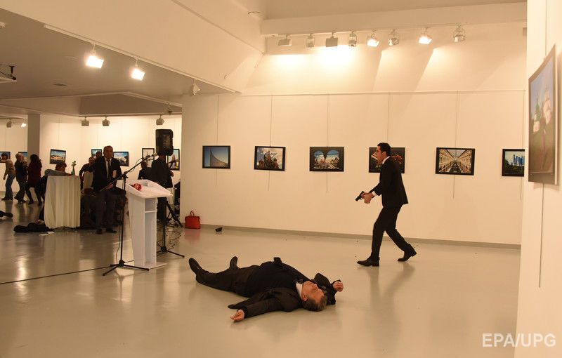 Агентство EPA опубликовало фотографии с места покушения на посла России Андрея Карлова в столице Турции Анкаре, которое было совершено в присутствии журналистов и фоторепортеров в центре современного искусства Анкары. Карлов направлялся к трибуне, чтобы произнести приветственную речь. Его расстрелял сотрудник турецкой полиции Мевлют Мерт Алтынташ, который охранял посольство РФ. Нападавший был убит. К зданию МИД РФ в Москве россияне несут цветы.