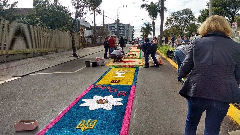 Улицы бразильского города Касадор украшены украинскими трезубцами из опилок. Об этом сообщает VIDIA со ссылкой на посольство Украины в Бразилии. Украшения сделала украинская община города по случаю праздника Тела и Крови Христовых, который недавно отмечали католики Бразилии.