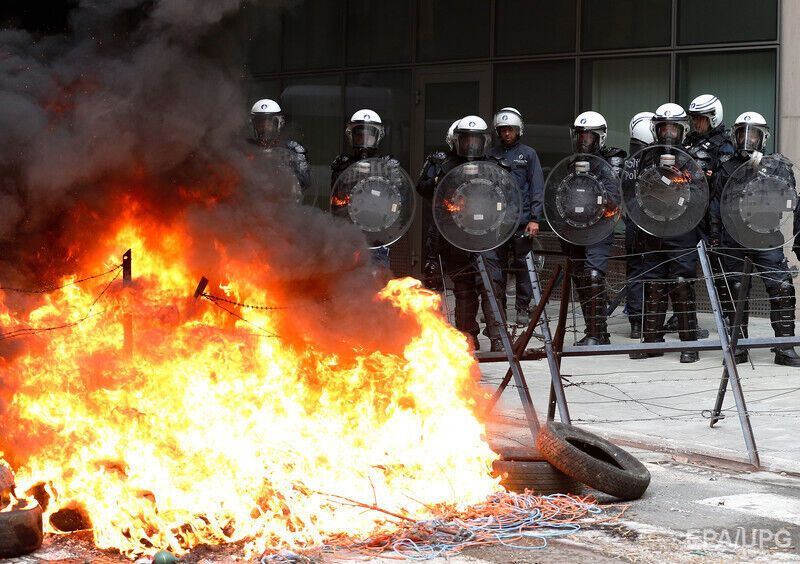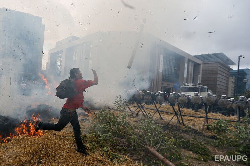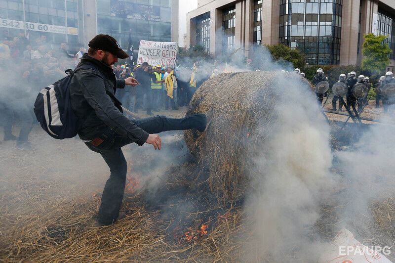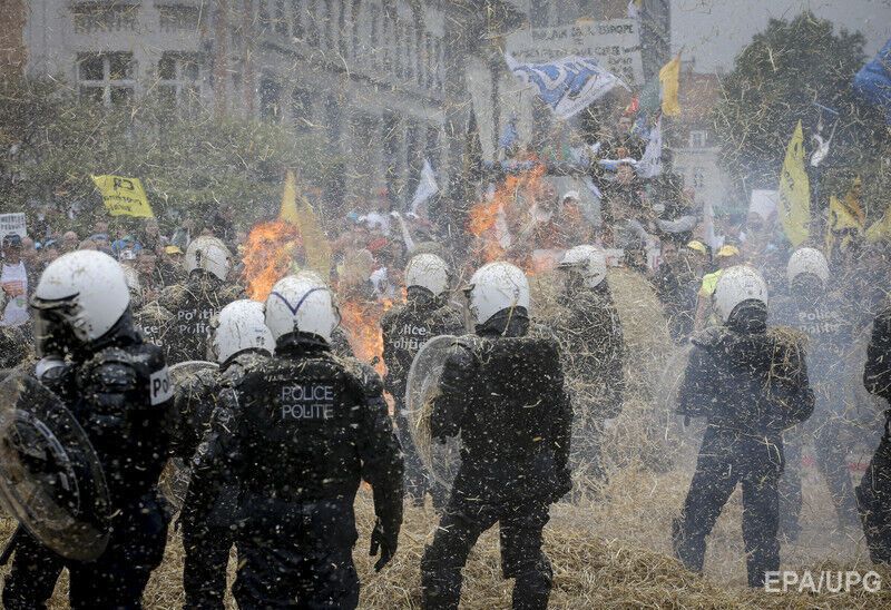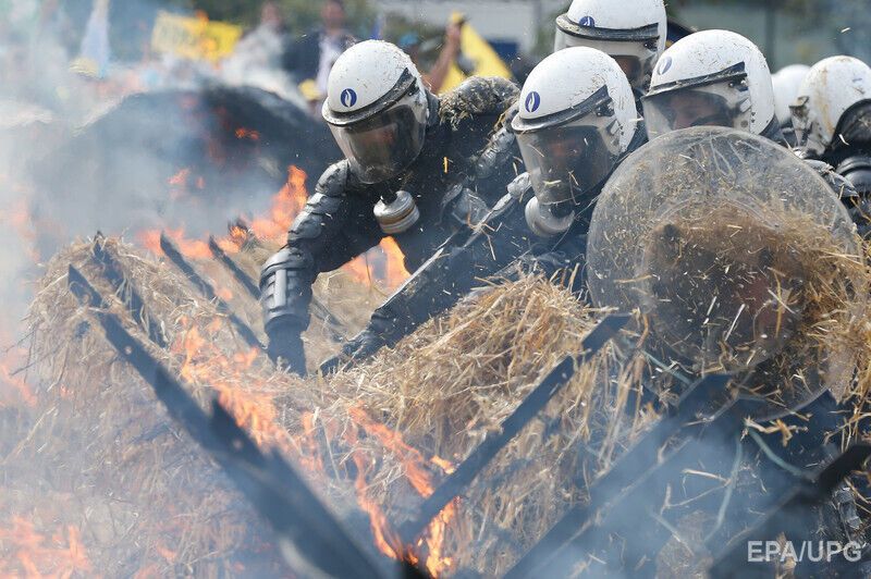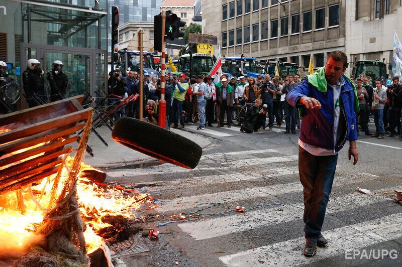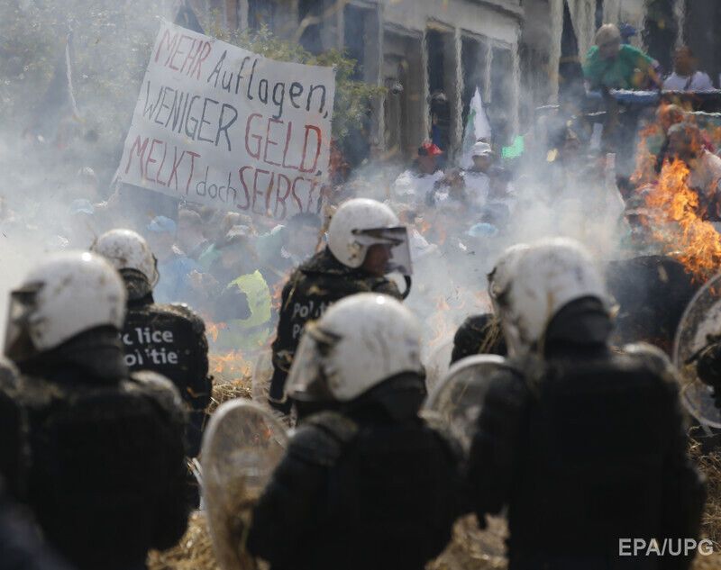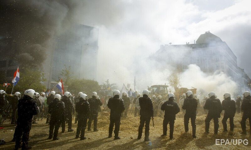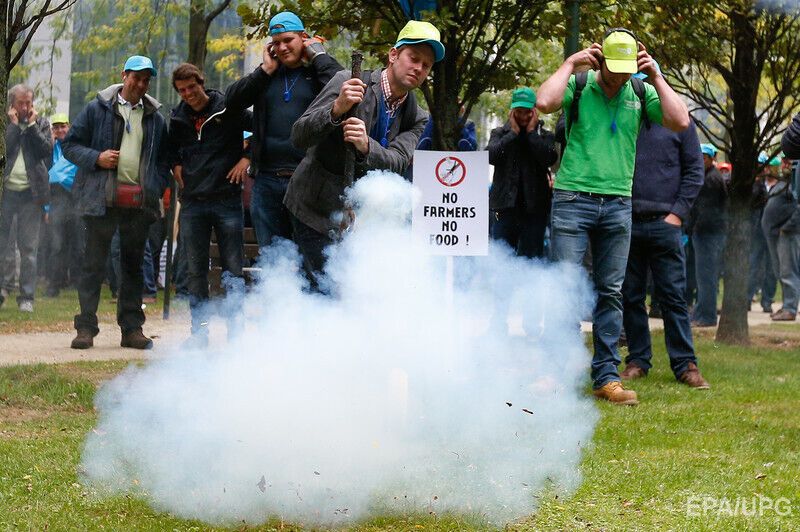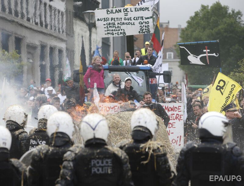 В понедельник, 7 сентября, улицы Брюсселя заблокировали тысячи недовольных европейских фермеров в знак протеста против резкого падения цен на их продукцию. Как сообщает BBC, в основном на акцию съехались фермеры из Бельгии, Франции и Германии. По оценкам полиции, в протесте участвуют около 4800 человек и 1450 тракторов. Главная акция проходит у штаб-квартиры Европейского союза, где министры сельского хозяйства собрались на экстренную встречу, чтобы обсудить сложившуюся ситуацию в аграрном секторе. По информации The Guardian, некоторые фермеры забросали правоохранителей яйцами и облили молоком, в ответ те применили водометы. Кроме того, протестующие жгли баррикады из сена и шин. Миссия Украины при ЕС сообщила в Facebook, что в Брюсселе евроинституции затянуты дымом, а на улице слышны звуки выстрелов. Падение цен на продукцию европейских аграриев обусловлено, среди прочего, снижением спроса со стороны Китая и российским продуктовым эмбарго.