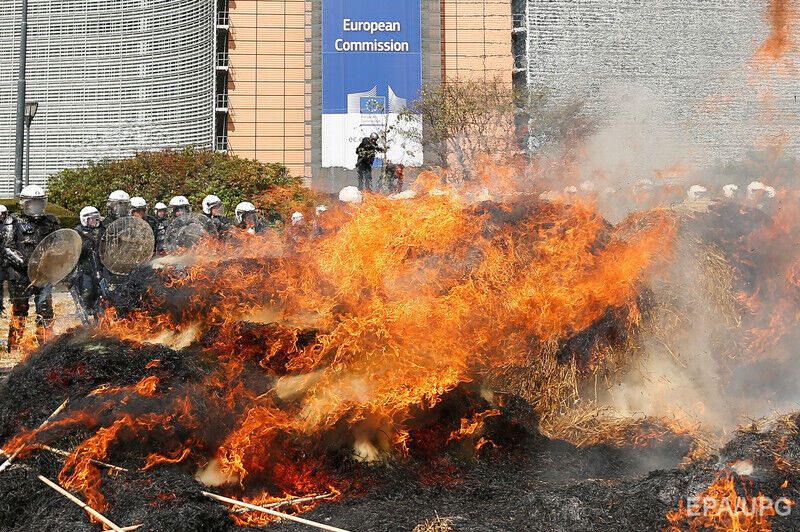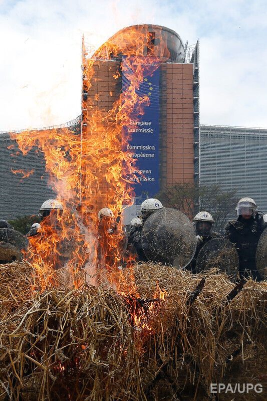 В Брюсселе фермеры жгут сено и шины, протестуя против низких цен на продукты. Фоторепортаж