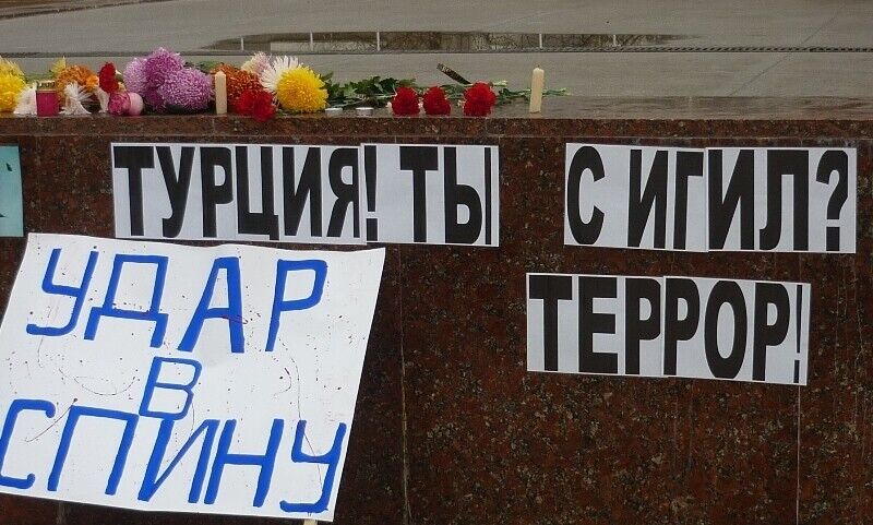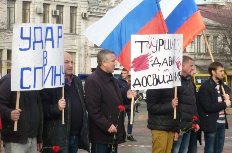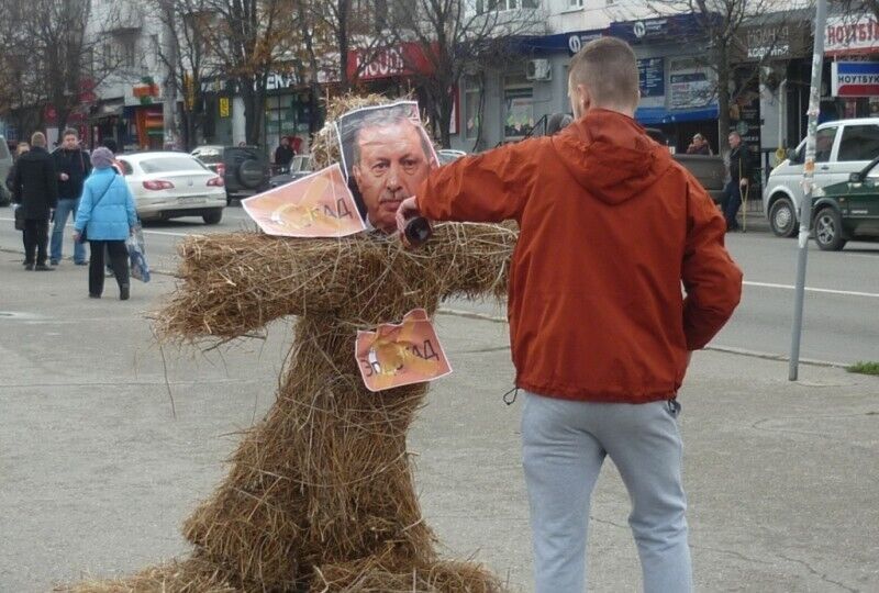 27 ноября на центральной площади Симферополя прошла акция "молодежных общественных организаций", на которой было сожжено чучело с фотографией президента Турции Реджепа Эрдогана. Как сообщает крымское издание "15 минут", участники акции держали транспаранты с надписями "Удар в спину", "Турцию к ответу" и прочими лозунгами. За происходящим также наблюдали представители городской администрации, армянской общины и духовенства. Во время сожжения чучела люди выкрикивали "Смерть Эрдогану".