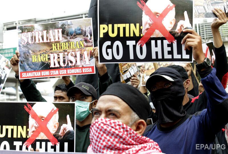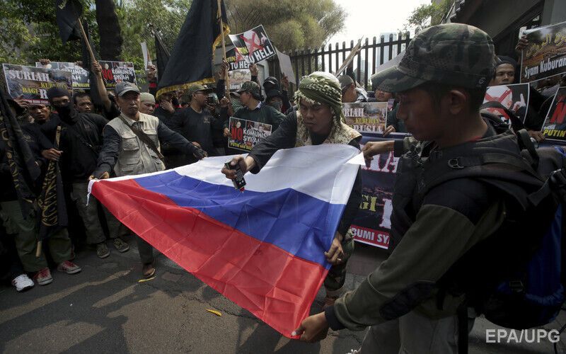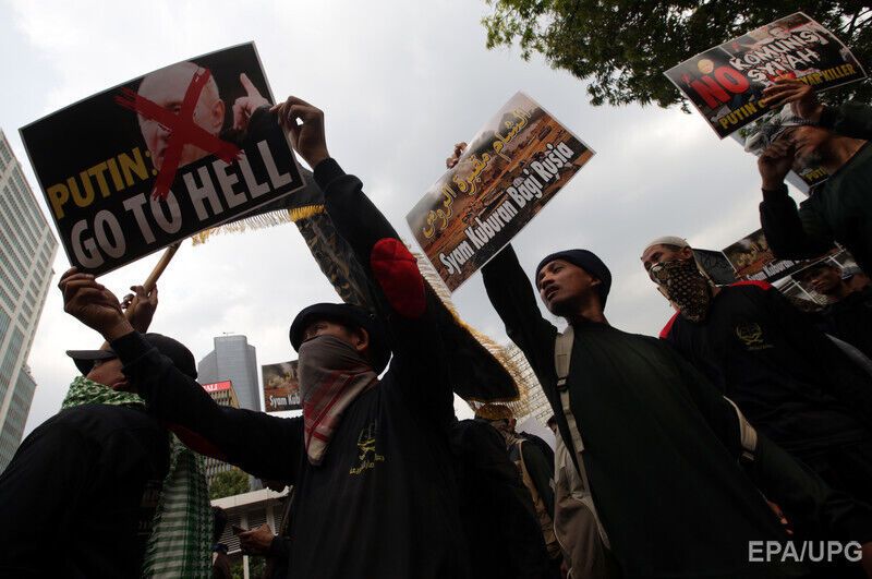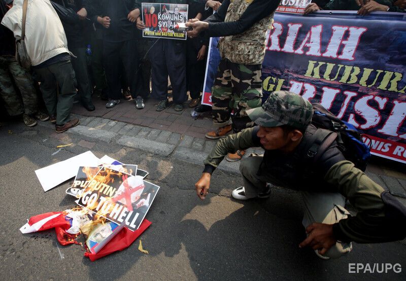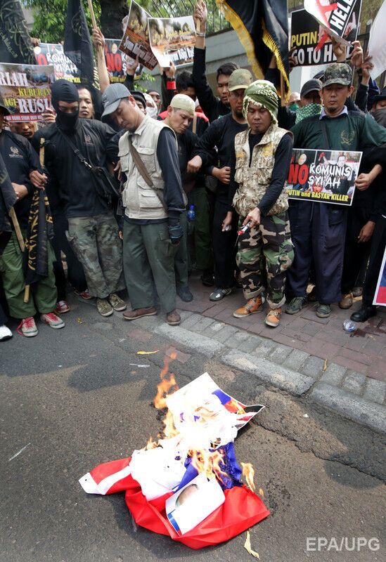 В столице Индонезии Джакарте сотни индонезийских мусульман радикального направления устроили возле российского посольства митинг в знак протеста против военной операции Москвы в Сирии. Митингующие вышли с плакатами "Путин, иди к черту" и сожгли российский флаг. Часть протестующих была в балаклавах.