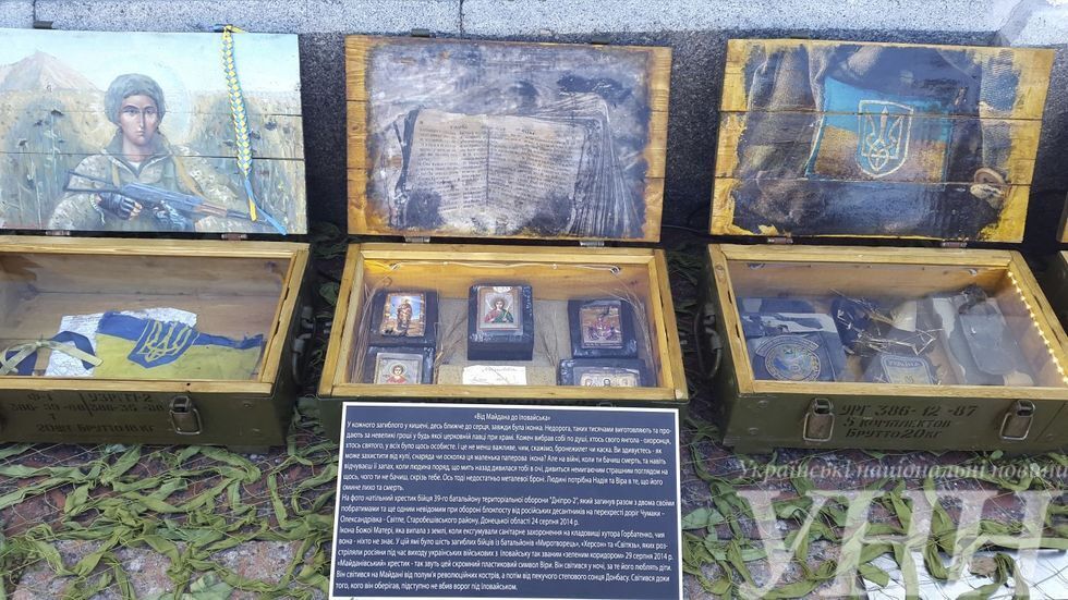 Сегодня, 28 августа, в Киеве на Софийской площади провели акцию памяти погибших украинских военных под Иловайском в августе 2014 года. Как передает "Интерфакс-Украина", на площади собралось около сотни матерей и вдов погибших воинов, бойцов добровольческих батальонов, активистов. Они почтили память военных, погибших в Иловайском котле. По информации УНН, также на Софийской площади возле Михайловского Златоверхого монастыря расположена выставка "Блокпост памяти" с вещами погибших под Иловайском украинцев. Организаторы выставки создали "Коридор памяти" и просят всех неравнодушных прийти и почтить память погибших бойцов. "Выставка переездная, она была в Чернигове, Запорожье, скоро поедет на передовую. Здесь мы будем стоять всю ночь, до 22.00 29 августа, и просим всех ставить вдоль этого зеленого коридора, который стал коридором смерти для наших бойцов, лампадки, и это будет коридор памяти", – сообщил один из организаторов выставки.