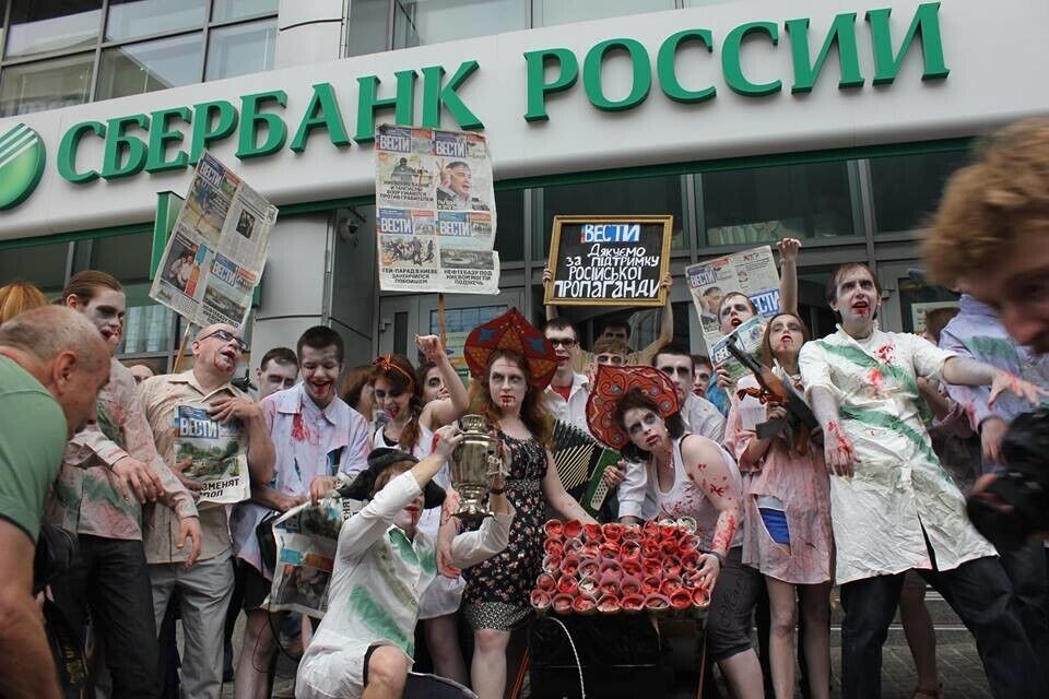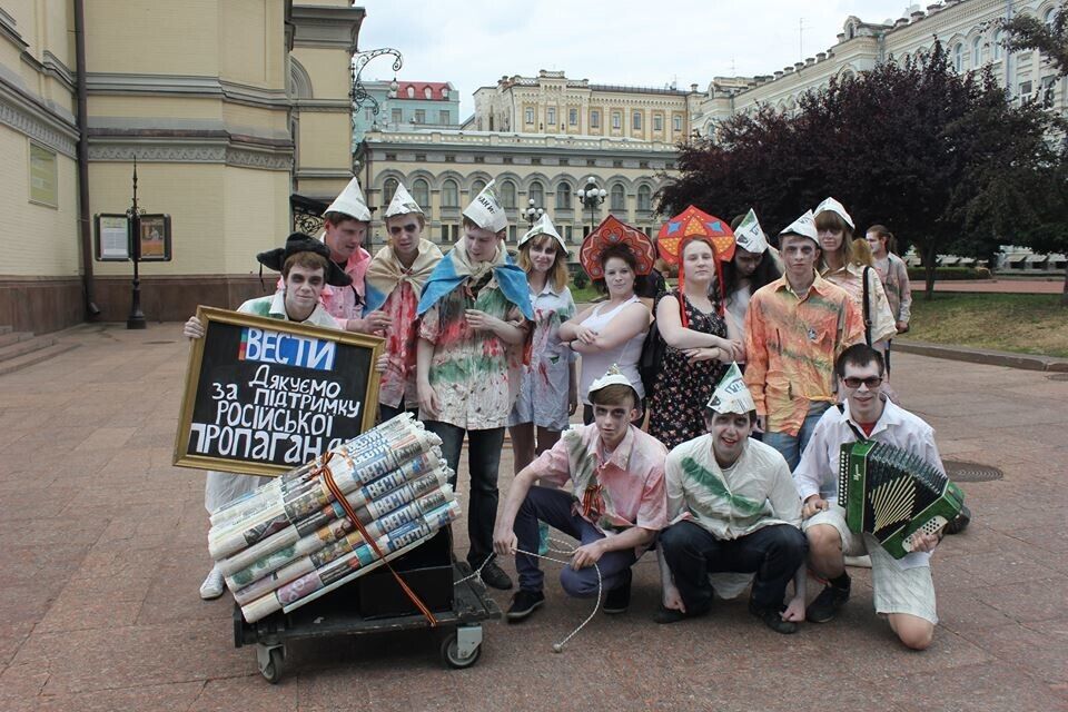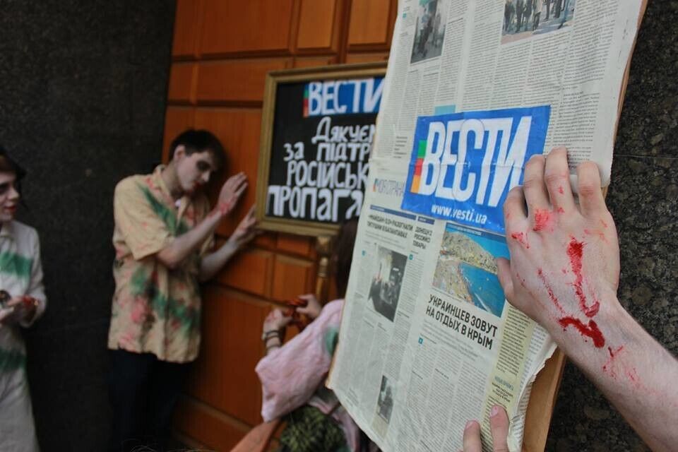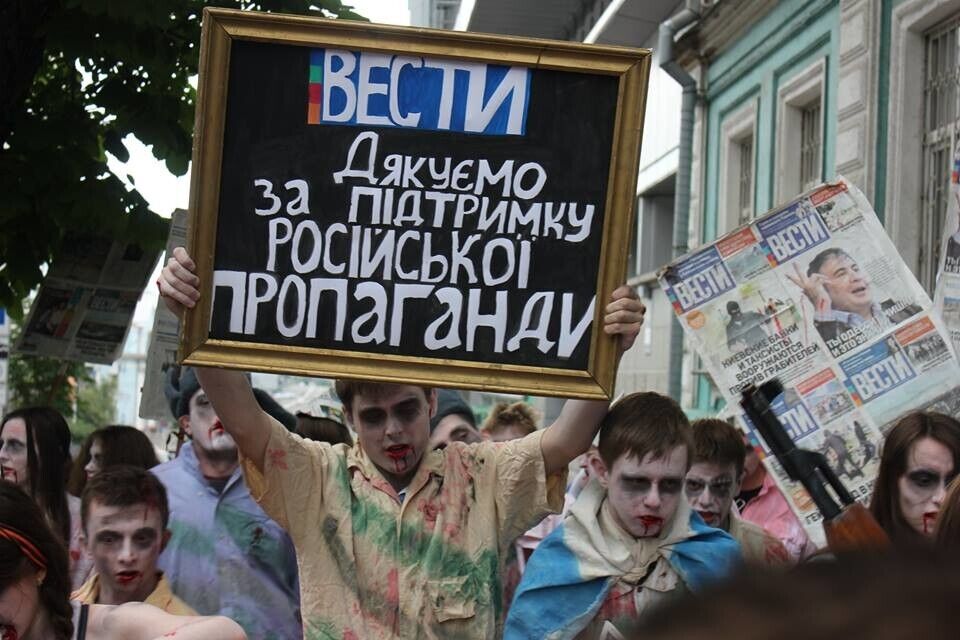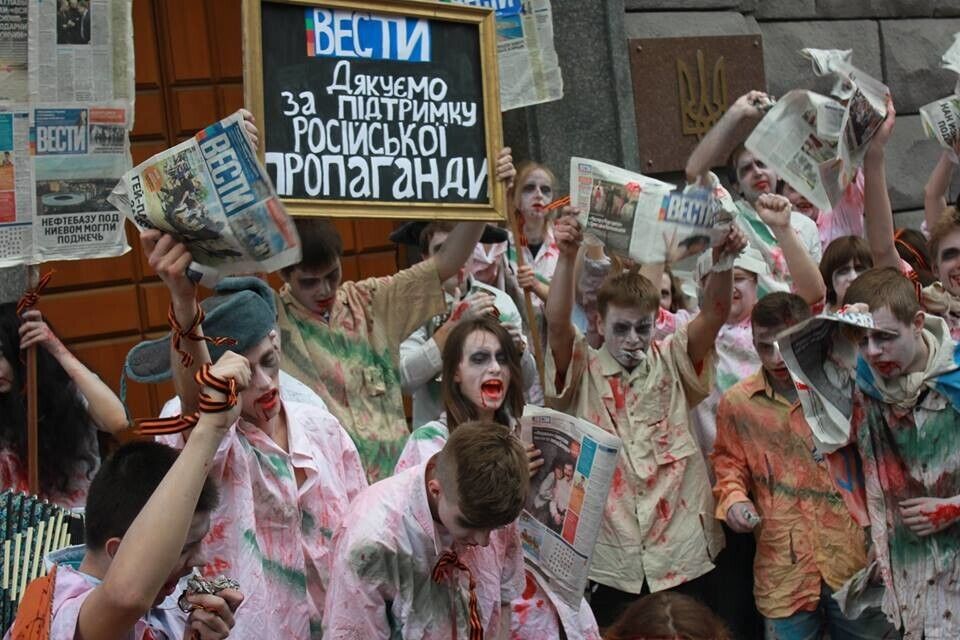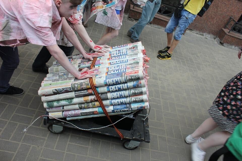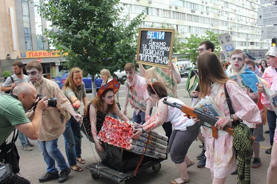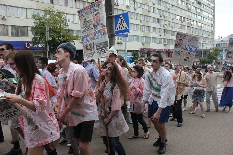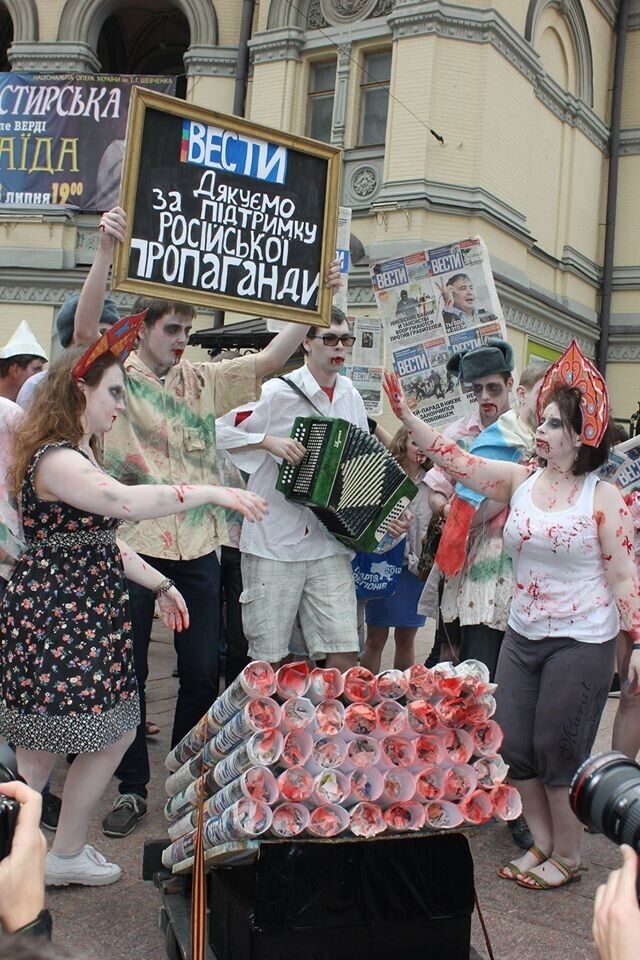В воскресенье, 21 июня, в Киеве состоялся "большой марш зомби", сообщается на странице движения "Відсіч" в Facebook. Загримированные активисты призывали прохожих не прекращать читать "правдивейшую кремлевскую пропаганду" и распространять газету среди знакомых и родственников. Конечным пунктом марша было центральное отделение СБУ, куда активисты пришли, чтобы "поблагодарить" за поддержку пророссийской газеты "Вести" и защиту "свободы кремлевского слова" в Украине.