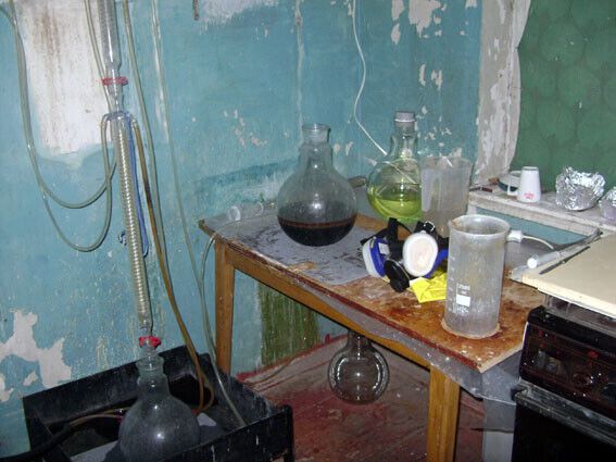 Мариупольские милиционеры изъяли ядовитые химикаты и оборудование, применяемые для синтеза метамфетамина из подпольной лаборатории, расположенной в квартире пятиэтажки, сообщили в пресс-службе ГУ МВД Донецкой области. Там была создана профессиональная химическая лаборатория с полным циклом изготовления наркотического вещества. В холодильнике нашли заготовки, правоохранители установили, что процесс находится на подготовительном этапе. Милиция изъяла мешок едкого натрия весом 25 кг и еще один, почти опустошенный, а также три канистры по 30 л неизвестных химических веществ, лабораторные колбы, прессы, фольгу и другое оборудование для производства наркотика. Кроме того, были обнаружены противогазы, которые использовались непосредственно во время "варки", и травматическое оружие. Установлено, что квартира принадлежит местному жителю 1929 года рождения, который сдавал ее в аренду.