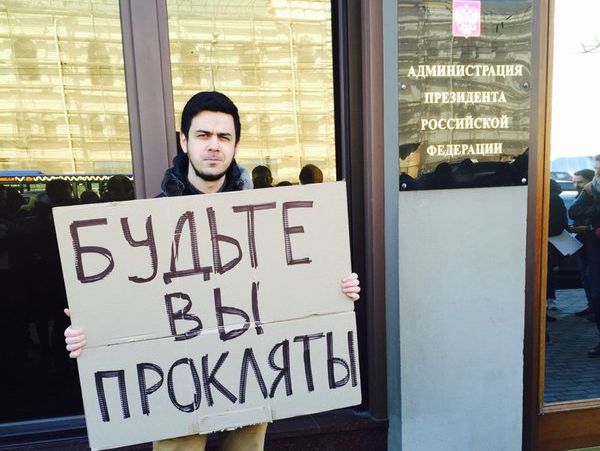 10 марта возле здания администрации президента России в Москве гражданские активисты и журналисты провели серию одиночных пикетов в знак протеста против произошедшего накануне нападения на журналистов и правозащитников "Комитета против пыток", в результате которого автобус, в котором они ехали, был разгромлен и сожжен "боевиками из автомобилей 95-го региона". Журналистов (в том числе, двух иностранцев) избили палками и досками, в автобусе сгорели их паспорта и техника. Как сообщил в своем аккаунте в Twitter супруг участницы Pussy Riot Надежды Толоконниковой, активист группы "Война" Петр Верзилов, манифестанты держали в руках плакаты с надписями "Будьте вы прокляты", "На чеченской границе напали на журналистов и правозащитников. Требую найти заказчиков" и другие.