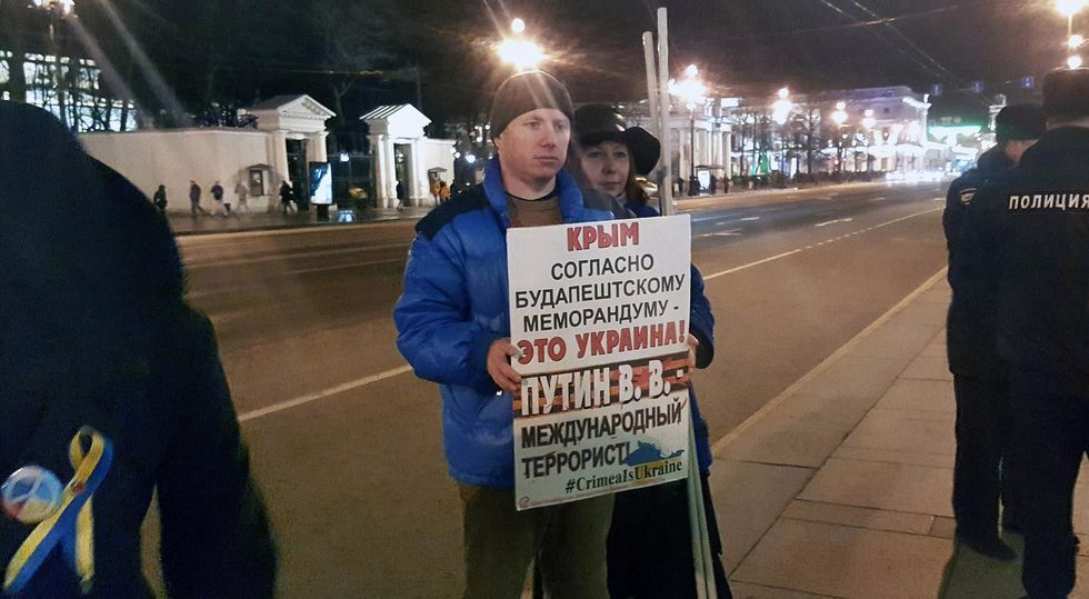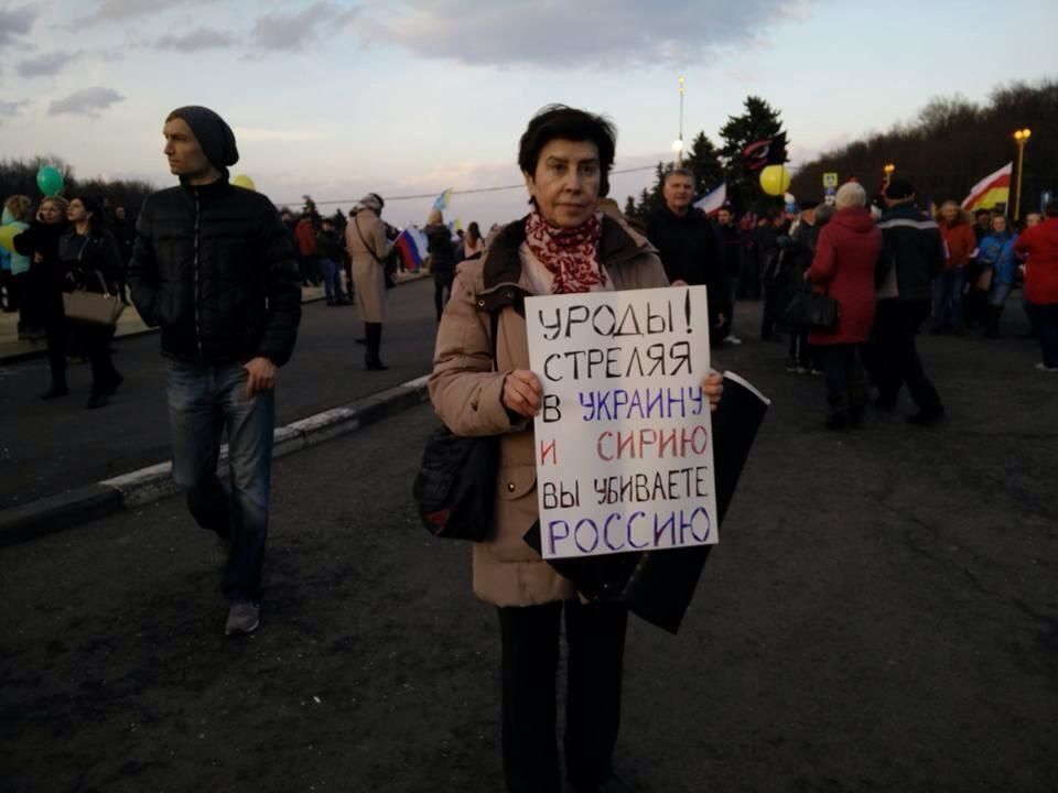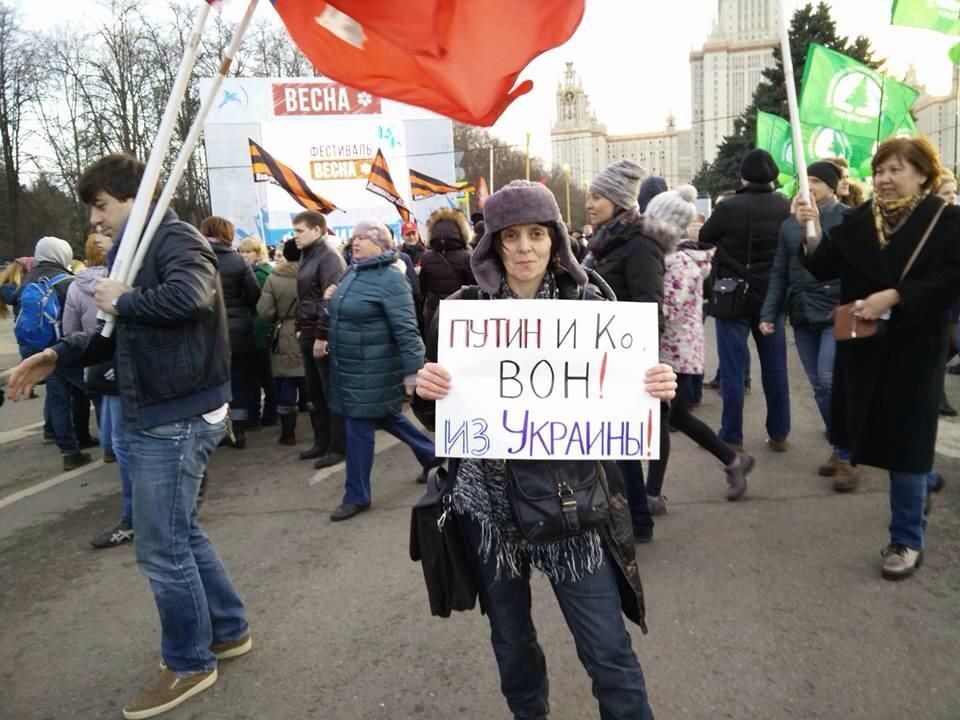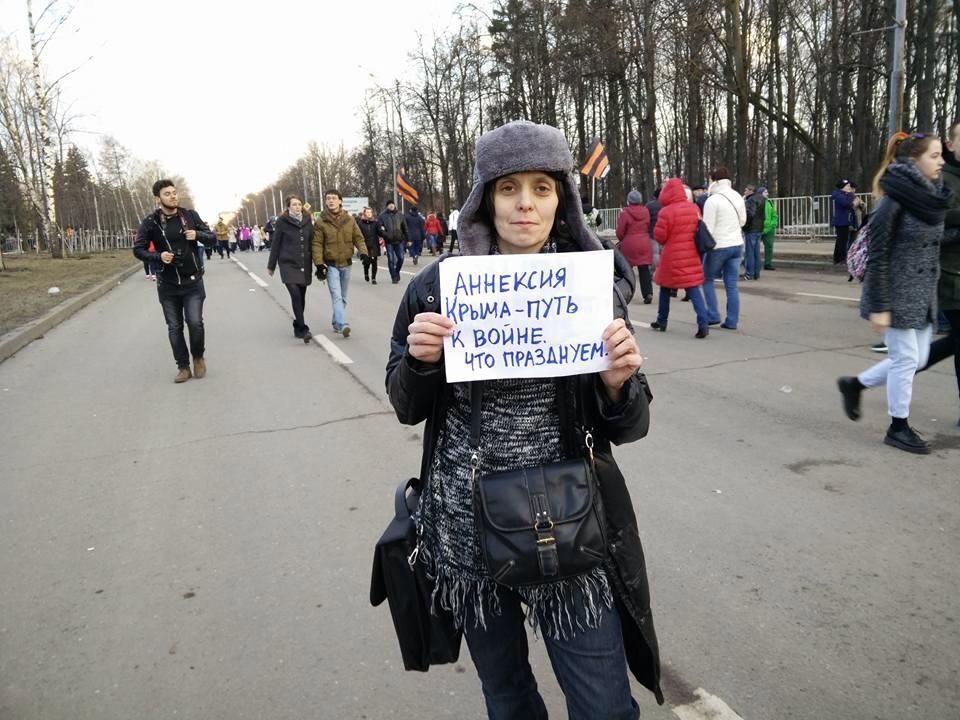18 марта на митинг-концерт "Весна", посвященный трехлетию аннексии Крыма Россией пришло несколько человек с плакатами в поддержку Украины. Пользователь Елена Тихончук опубликовала в Facebook фотографии людей с плакатами "Уроды! Стреляя в Украину и Сирию вы убиваете Россию!", "Путин и Ко, вон из Украины". Активисты также требовали от российских властей освободить политических заложников – граждан Украины. Российские власти заявили, что на митинге-концерте в честь аннексии Крыма было около 150 тыс. человек, передает РБК.