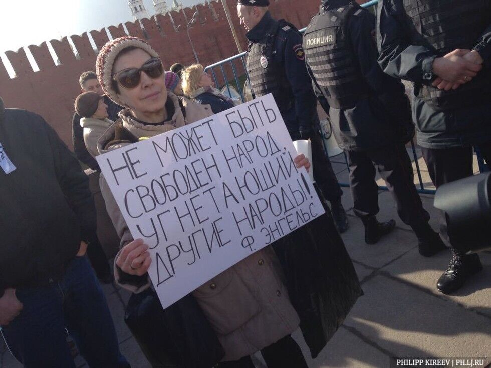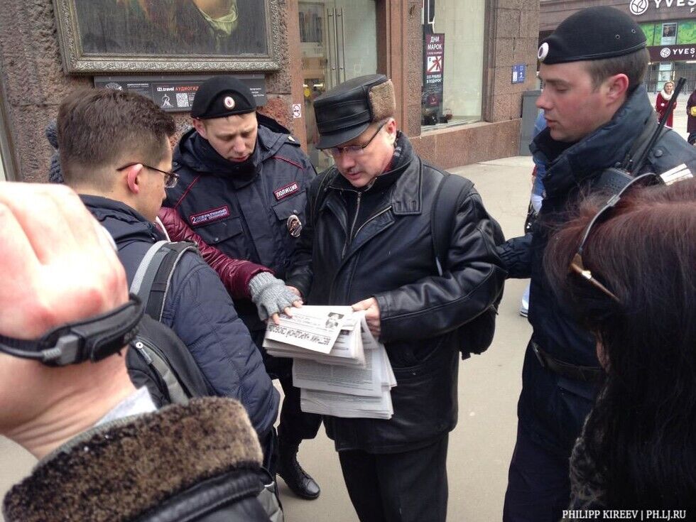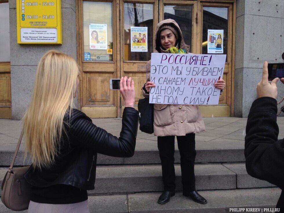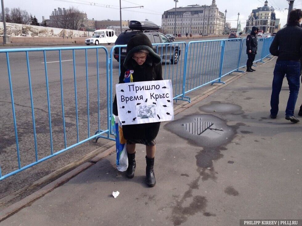 На Тверской улице в центре Москвы силовики задержали четырех российских оппозиционных активистов, которые принимали участие в так называемых одиночных пикетах, сообщает "Радіо Свобода". Задержанными являются Павел Кузнецов, Михаил Лашкевич, Виктор Андреев и Ирина Калмыкова. Кузнецов держал плакат, на котором было написано "Путин – это Гитлер сегодня". Одиночный пикет – единственная в России форма протеста, которая не требует разрешения органов власти.