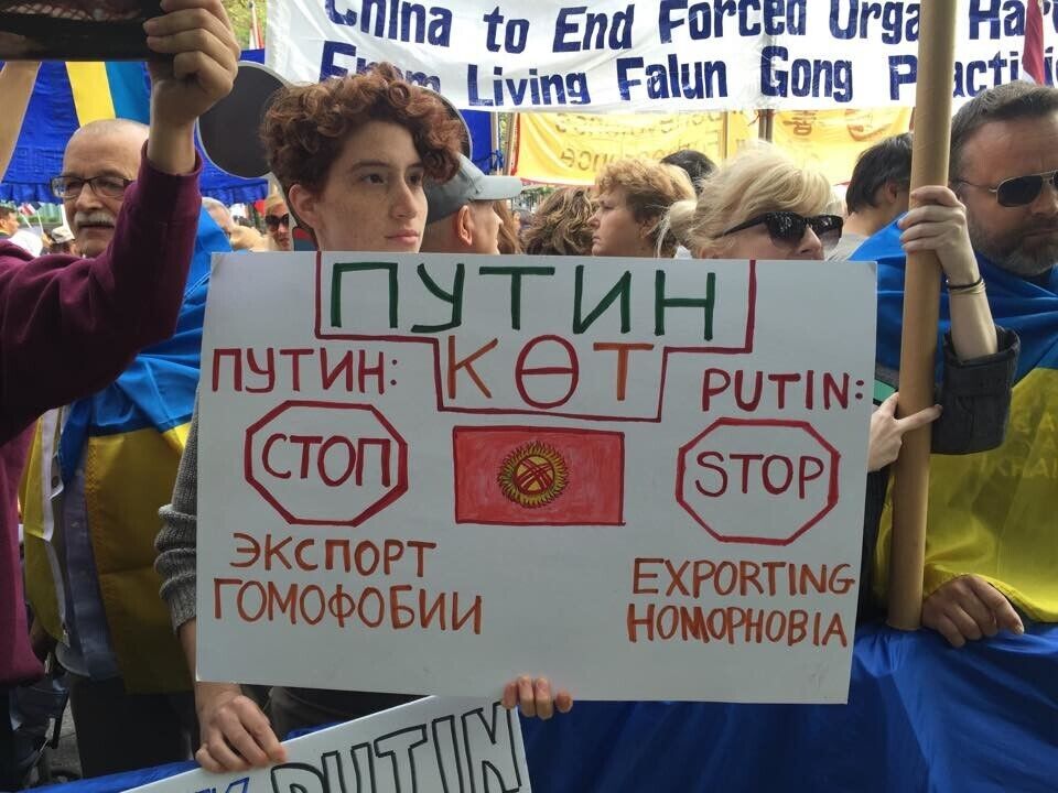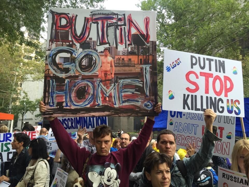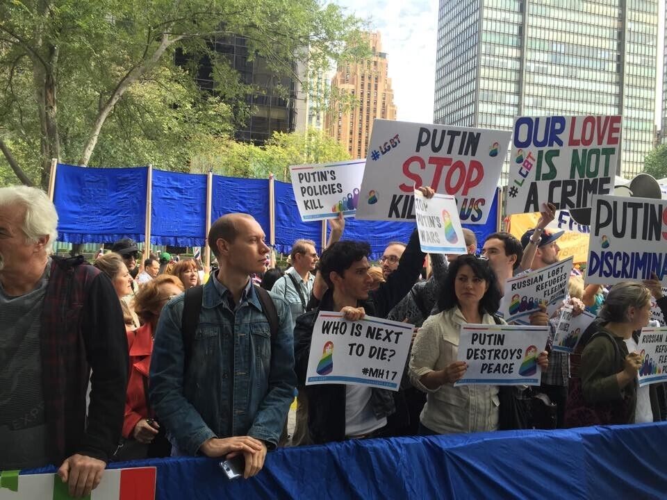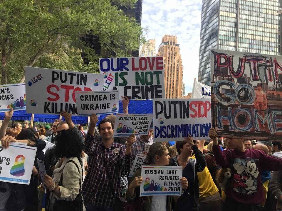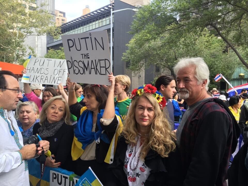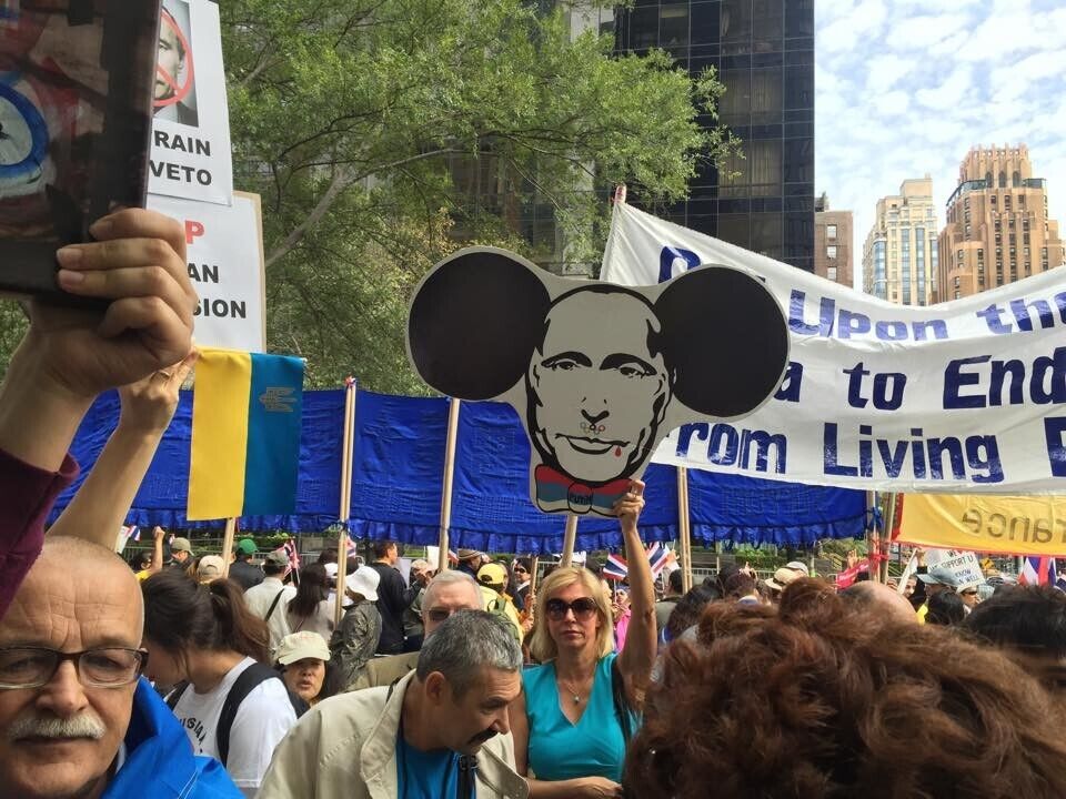 27 сентября в Нью-Йорке состоялся митинг против политики российского президента Владимира Путина. Среди лозунгов и требований участников акции – освобождение политзаключенных, восстановление суверенных границ, международный трибунал по крушению MH17, призыв к прекращению экспансионистской войны Путина.