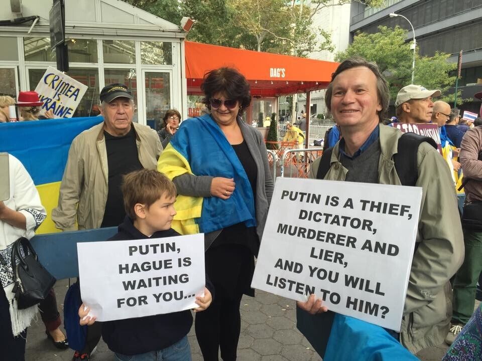 В воскресенье, 27 сентября, в Нью-Йорке прошла акция протеста против политики российского президента Владимира Путина. Главный лозунг митинга – "Putin to trial!" – "Путина под суд!", – сообщила в Facebook журналист "Радио Свобода" Елена Рыковцева, которая находится в США. Протестующие собрались около здания представительства России в ООН с плакатами "Все мы – Украина", "Остановите агрессию Путина". 28 сентября состоится протестное шествие к штаб-квартире ООН в Нью-Йорке в то время, когда должно состояться выступление президента Путина на сессии Генеральной Ассамблеи ООН.