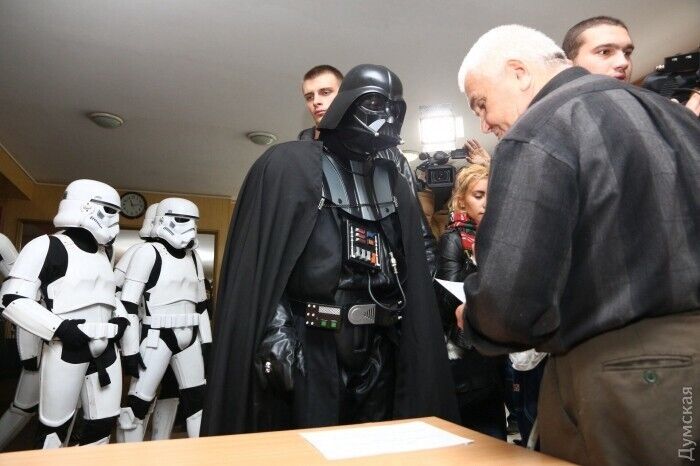 Как сообщило издание "Думская", кандидат в мэры Одессы Дарт Вейдер не смог проголосовать на местных выборах 25 октября, поскольку его имени не оказалось в списках избирателей. "Это свидетельствует о масштабных фальсификациях. Кому-то очень не хочется, чтобы победили достойные", – заявил герой киноэпопеи "Звездные войны", прибавив, что фигурировал во всех избирательных списках начиная с 1991 года. Рядом с избирательным участком полиция задержала другого героя "Звездных войн" – Чубакку – за отсутствие прав на управление автомобилем, сообщил "Южный курьер". По данным издания, Чубакка неправильно припарковал автомобиль возле избирательного участка, чем и привлек внимание правоохранителей.