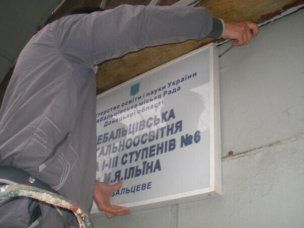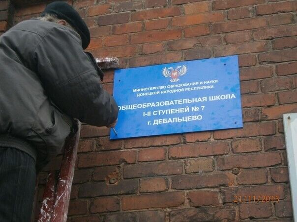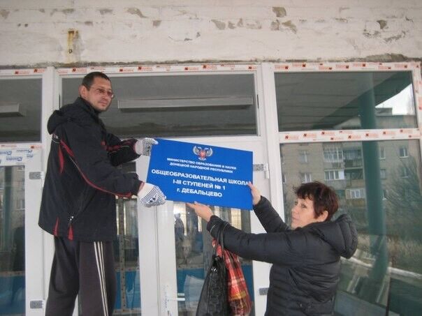 В подконтрольном террористам "ДНР", разрушенном войной Дебальцево сепаратисты заменили украинские таблички на городских школах аналогичными вывесками на русском языке и с двуглавым орлом, сообщает "Четвертая власть". При этом издание отметило ,что никаких других ремонтных работ в пострадавших от российских артобстрелов зданиях не проводилось. А фотографии торжественной замены украинских вывесок сепаратисты выложили на своих ресурсах.