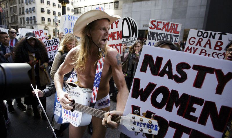 В Нью-Йорке (США) активистки Национальной организации женщин пикетировали здание Trump Tower, принадлежащее кандидату в президенты Соединенных Штатов от Республиканской партии Дональду Трампу. Участники акции протеста пришли, чтобы "взять Трампа за яйца" (Grab Trump by the ballot) в связи с его скандальными высказываниями о женщинах, сообщается в Twitter организации. Протесту пытался препятствовать сторонник Трампа – уличный артист Роберт Джон Берк, известный как Голый Ковбой.