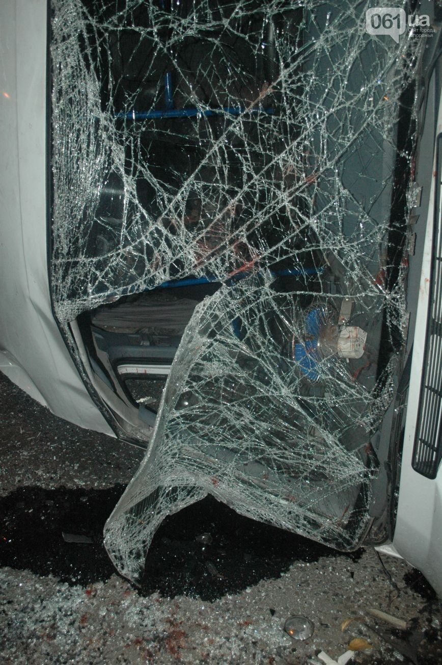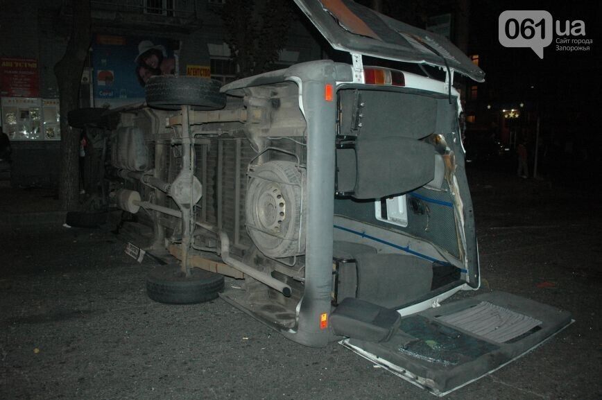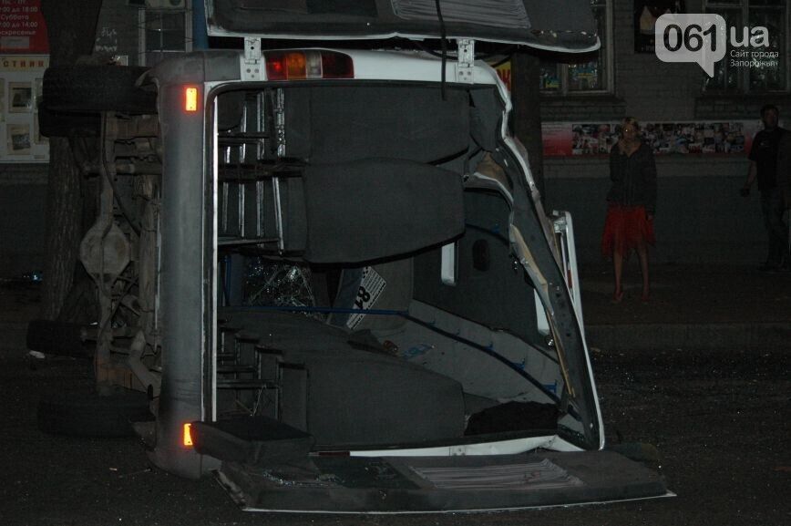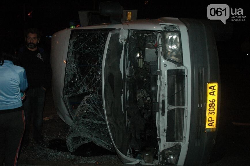 Поздним вечером 16 сентября в центре Запорожья, в районе перекрестка ул. Грязнова с проспектом Ленина, маршрутное такси №84 столкнулось с автомобилем Toyota, сообщает местный сайт 061.ua. "В результате сильного удара маршрутка перевернулась", – сообщил сайт. Очевидцы аварии рассказывают, что Toyota пересекала перекресток на зеленый сигнал светофора. В это время маршрутка, двигавшаяся по проспекту, попыталась проскочить на красный свет, что и стало причиной столкновения. Водитель маршрутки сразу после аварии скрылся с места ДТП. Очевидцы сообщают, что маршрутка минимум один раз полностью перевернулась через крышу. С места происшествия, по их словам, скорая помощь увезла не менее восьми пострадавших.