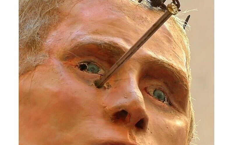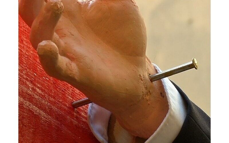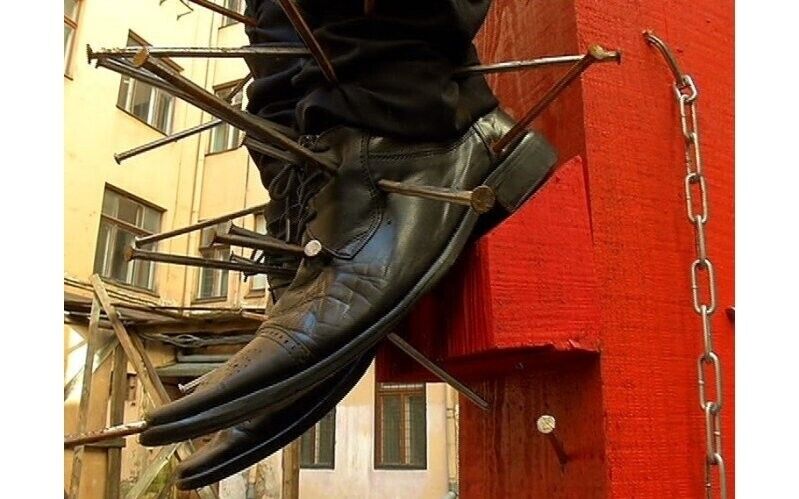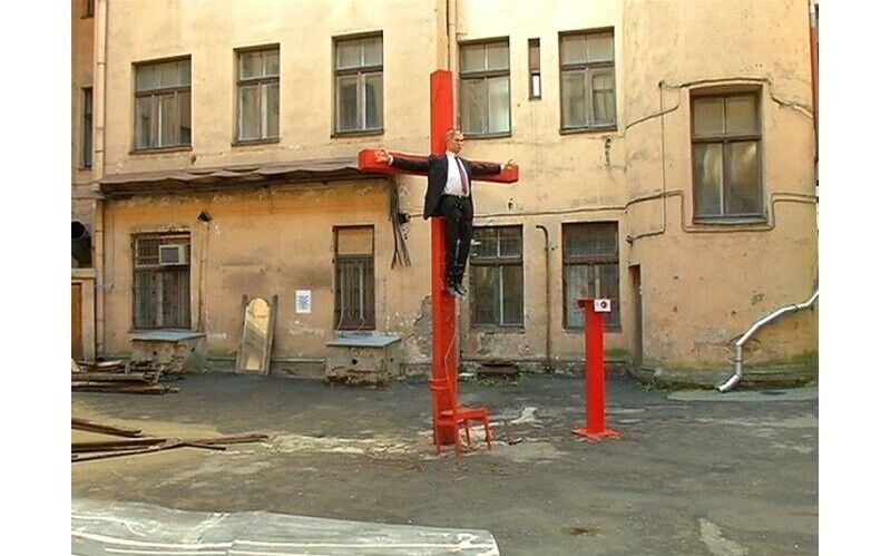 Вбить гвоздь в статую распятого президента России Владимира Путина могут все желающие. Кроме распятого Путина в бесплатной экспозиции находится еще 10 работ, в числе которых перевернутый кровоточащий автомобиль, внутри которого в Ночь музеев будет бить фонтан. Идея этой работы в том, что люди в грохоте города перестали слышать и видеть друг друга, сообщает Служба новостей телеканала ТВ5.