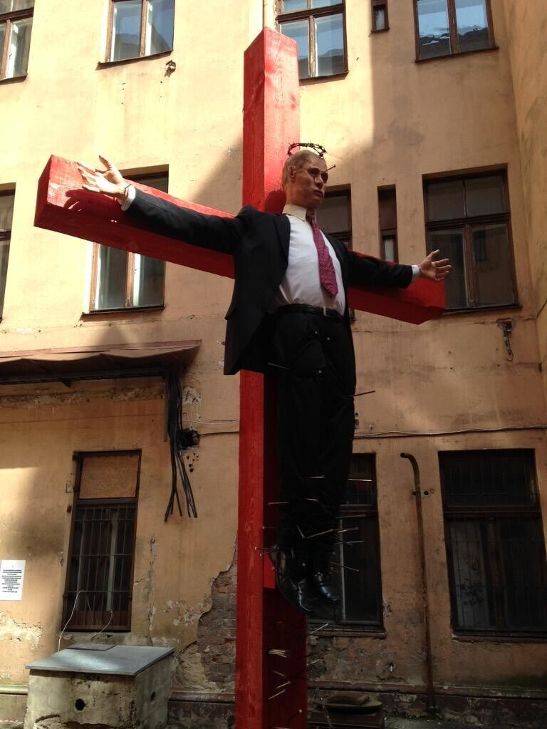 Во дворе бывшего здания КГБ в Риге установили статую распятого на кресте Путина. Фоторепортаж