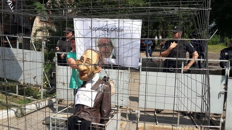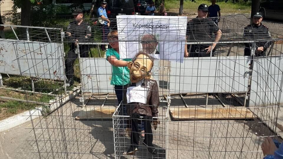 Возле суда в Полтаве чучело Кернеса посадили в клетку. Фоторепортаж