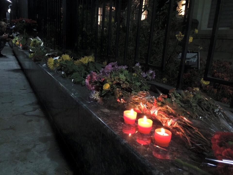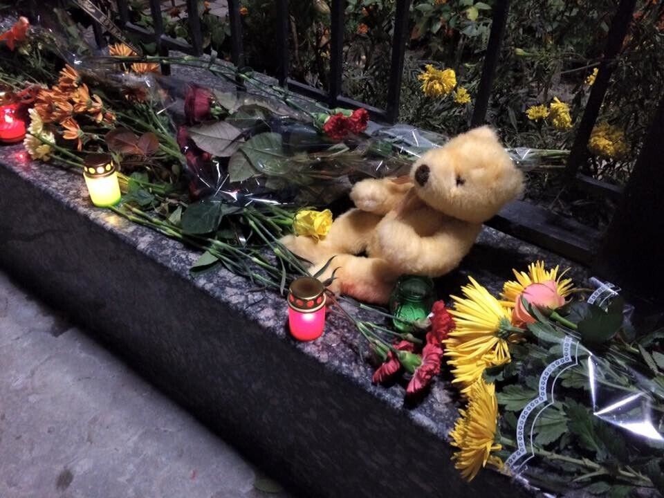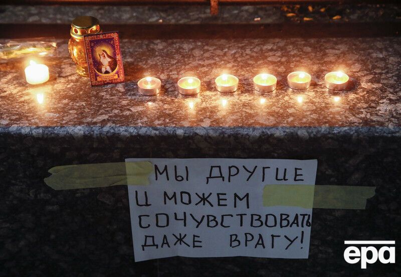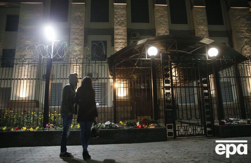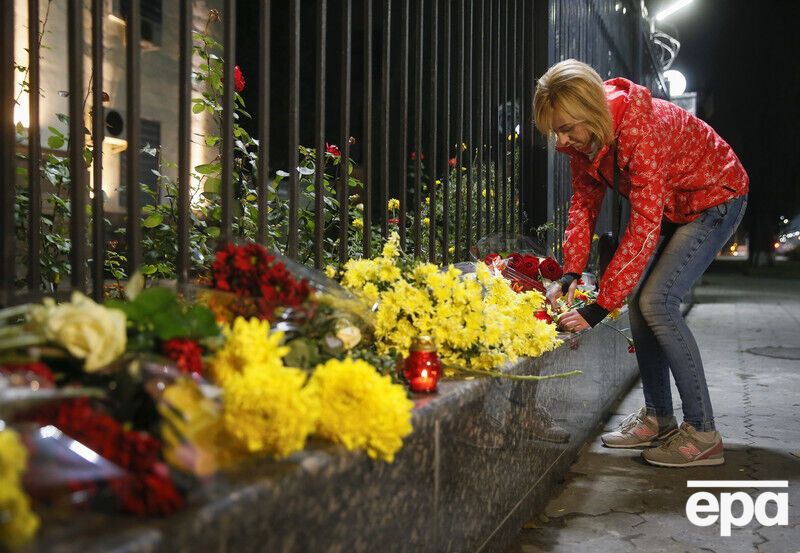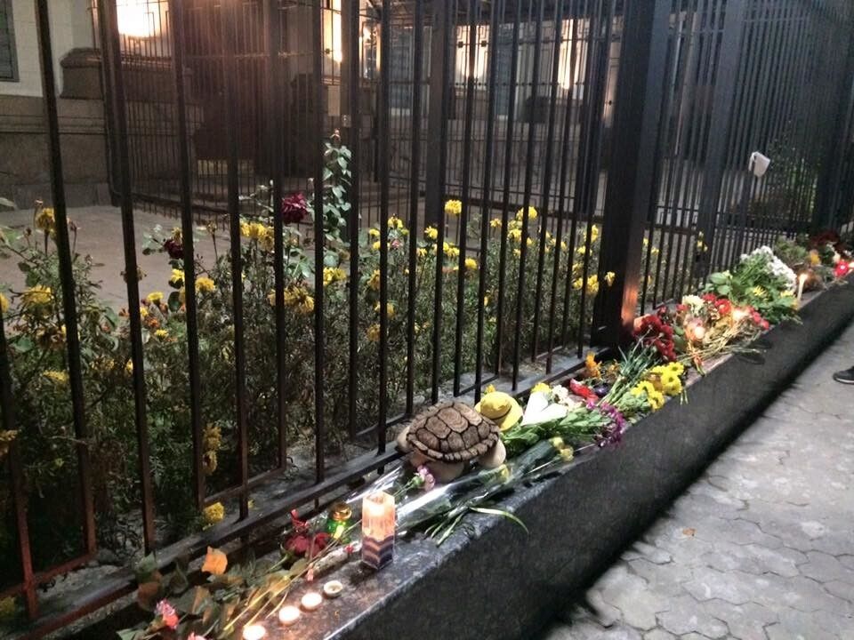 Украинцы несут цветы к посольству РФ в Киеве. Фоторепортаж