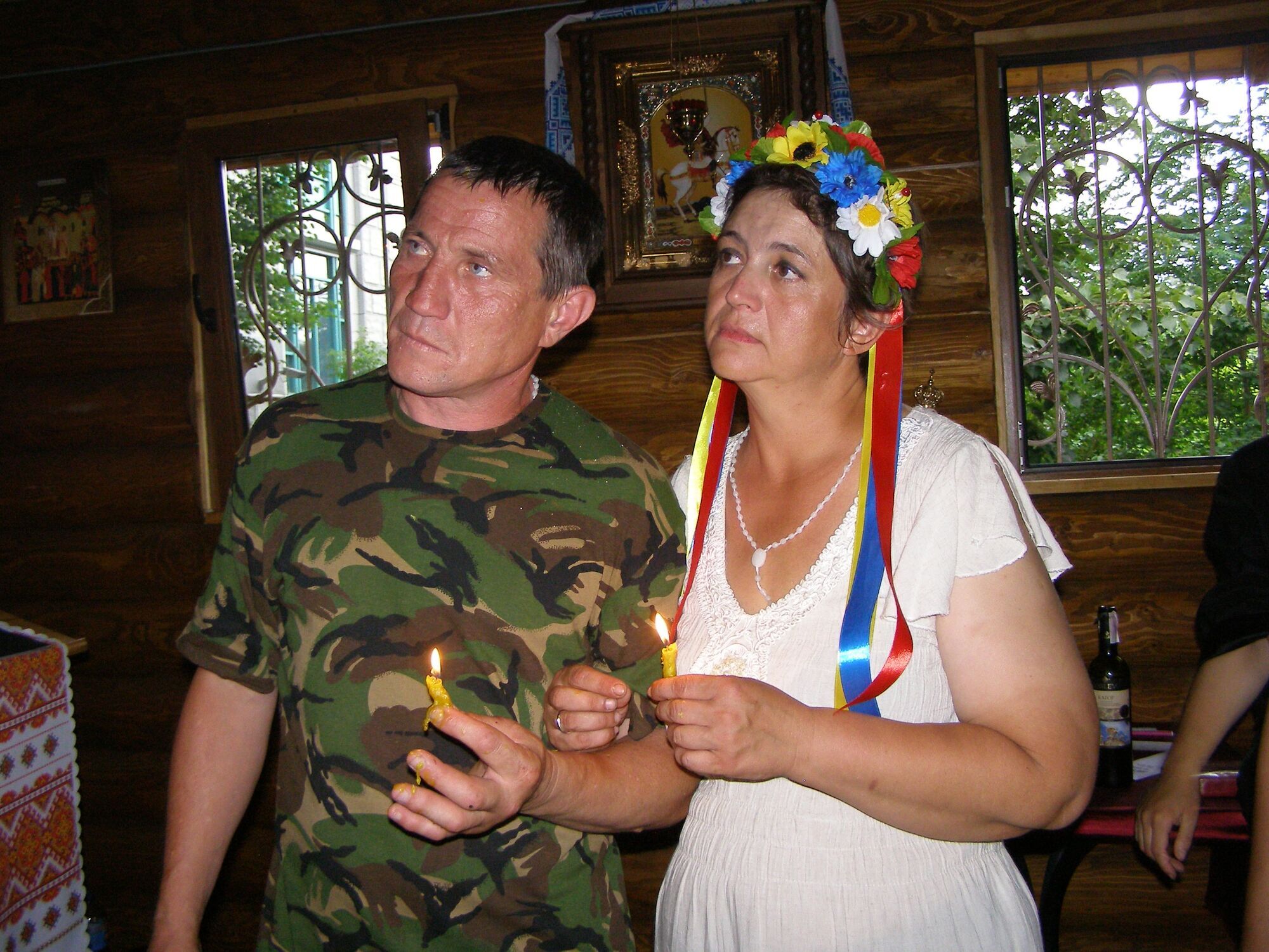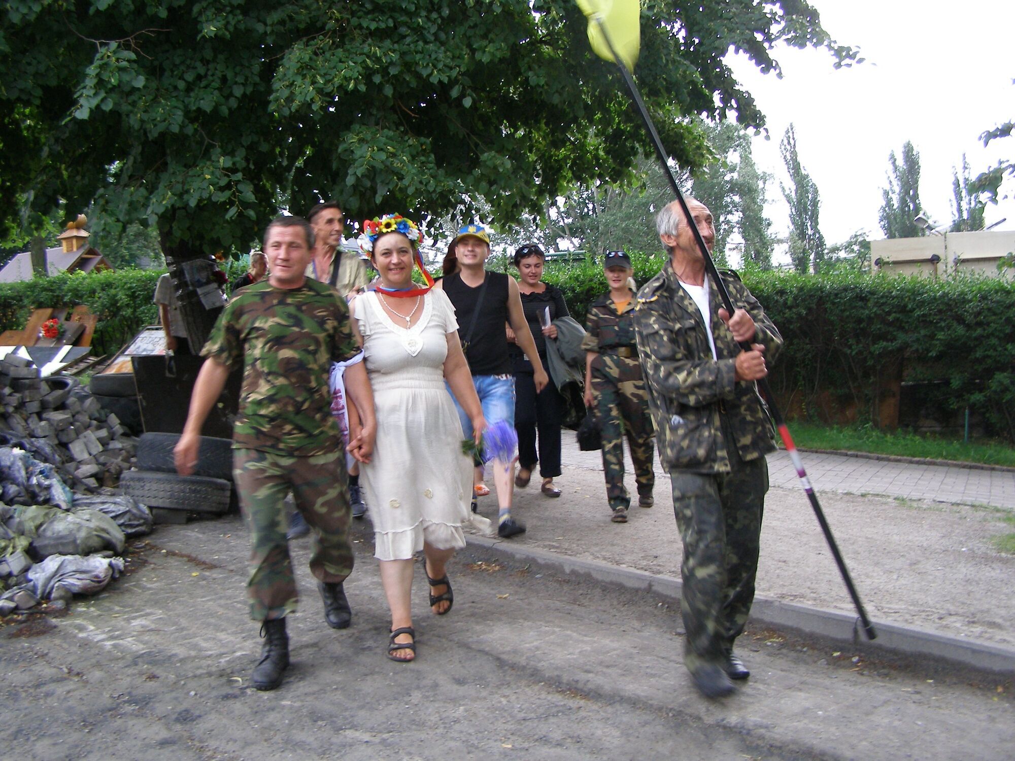 В общем, девочки мне платье белое принесли, а на ногах у меня были обычные шлепанцы. Но что поделаешь? Обвенчались в церкви на Институтской. Шли туда с флагом, с песнями. Отпраздновали бутылкой кагора на всю большую компанию. Да, Богдан еще мне яблоко купил. Вот и вся закуска.