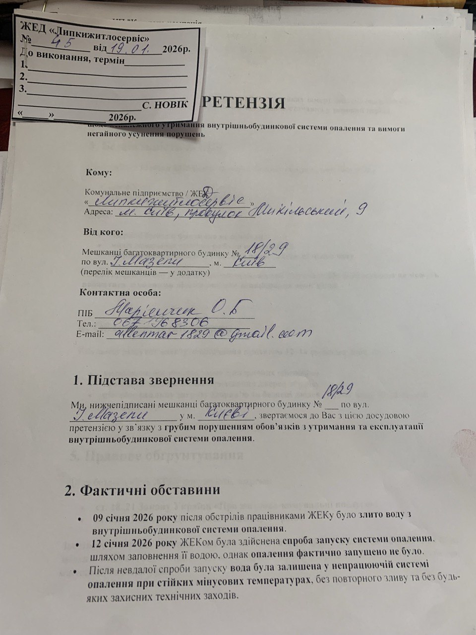 "Когда слесарь пришел, на улице было -17 °С и все замерзло. Далее началась такая тягомотина каждый день: "Я не знаю, где оно замерзло, и вообще ваш дом меня уже за...бал". Мы подавали заявки в ЖЭК. Я просила, чтобы ЖЭК дал нам документы с внутридомовыми коммуникациями, чтобы мы привлекли кого-то со стороны, чтобы они что-то сделали. Мы ходили, спрашивали, чем помочь. Ничем, – отметила Марьянчук. – Далее мы подали досудебную претензию о невозможности нашего ЖЭК сделать что-то с нашим домом. Они не могут или не хотят, я не знаю. И вот этот конфликт – он уже произошел, когда после обстрелов выключили водоснабжение, потом всем дали, а нам – нет. И оказалось, что у нас в подвальном помещении проходит труба, а в этом помещении было выбито окно, его никто не закрывал. Они там сделали какой-то склад труб, я так поняла, для нашего ЖЭК, для нашего дома. Они этими трубами, я так думаю, выбили это окно, когда заносили. А он мне рассказывает, что он ходит там где-то с газом, что-то греет".