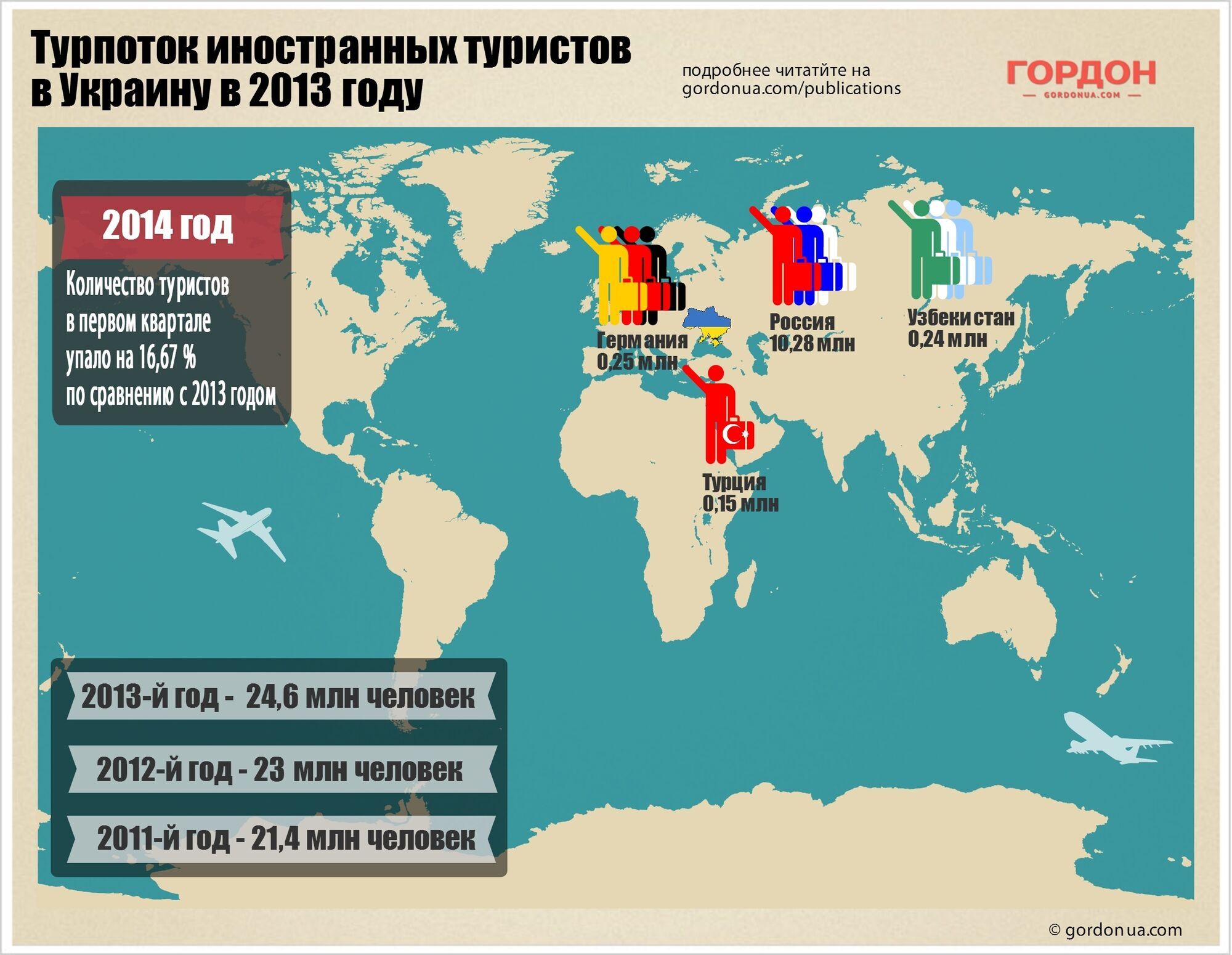 В первом квартале 2014-го года, по данным Государственного агенства Украины по туризму и курортам (Держтуризмкурорт), который, в свою очередь, ссылается на данные Госпогранслужбы, в нашу страну с туристической целью въехало 3,35 млн иностранцев, что на 16,67% меньше, чем за аналогичный период 2013-го года.