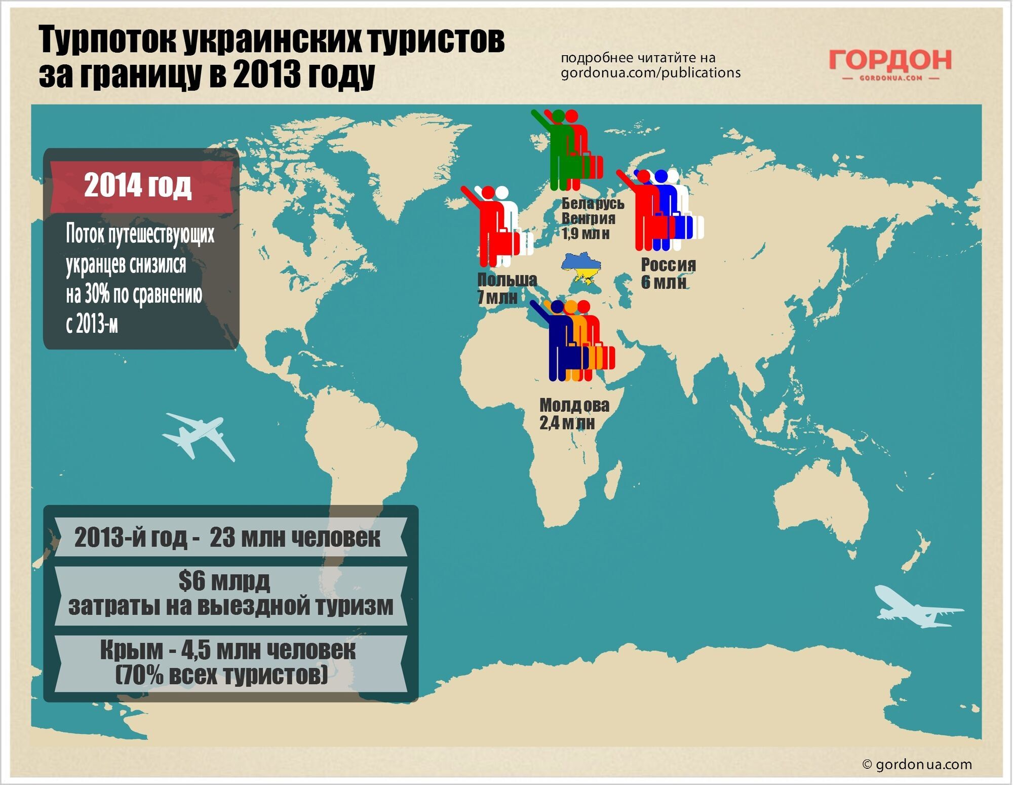 По данным Всемирной туристической организацией (UNWTO), Украина вошла в десятку стран с ростом расходов граждан на зарубежный туризм. Также более 4,5 млн украинцев в прошлом году отдохнули в Крыму, составив 70% всех туристов, посетивших полуостров.В этом году ситуация туманная. По данным Держтуризмкурорта, в первом квартале 2014-го за границу с туристической целью выехало 4,99 млн украинцев, что на 3,74% больше, чем за аналогичный период 2013-го года.