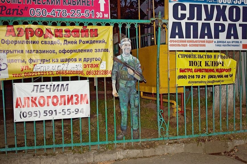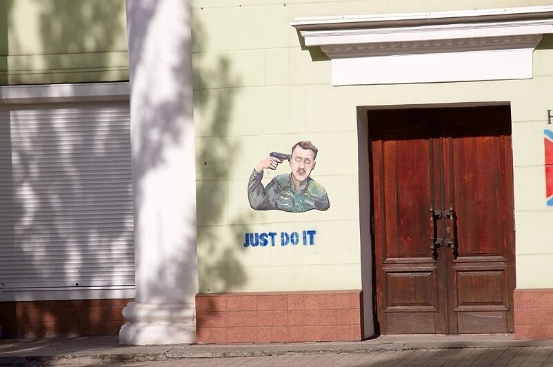 Спустя несколько дней в Донецке стали появляться фанерные карикатуры с изображением главарей террористов. Гиркин с пистолетом у виска и подписью: "Just do it". Сморчок Моторола, командир боевиков, рядом со своей дебелой невестой (их свадьба, судя по видео, выложенном в интернете, пела и плясала под стенами здания Донецкой обладминистрации, где в это время террористы пытали заложников). После крушения малайзийского "Боинга" прохожие на одной из улиц увидели образ Смерти с символикой "Новороссии" и рисунком со сбитым лайнером.