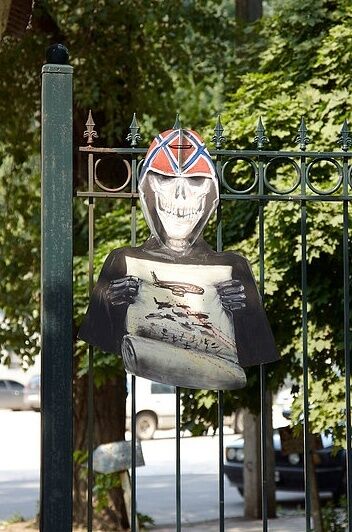 – Сначала мы присматривали место, обращали внимание на то, чтобы нигде поблизости не было видеокамер. Прежде чем у кинотеатра "Комсомолец" выставить "портрет" Гиркина-Стрелкова с пистолетом у виска, сделали сначала надпись, отошли на безопасное расстояние, проследили, все ли спокойно и только потом вернулись, чтобы его поставить. "Моторолу с невестой" перед входом во Дворец бракосочетаний установили, одну из работ – рядом с больницей им. Калинина, которая просто напичкана раненными боевиками. Только поставили, тут идут днровцы с автоматами, но, к счастью, ничего не заметили, а наш фотограф даже успел запечатлеть их, когда они прошли мимо инсталляции.