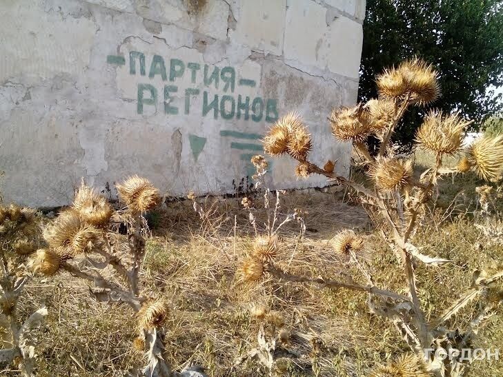 Пока Санек рассказывает мне увлекательную биографию бывшего хозяина полуострова, мы приближаемся к остаткам колхоза "Грузия". Старые разваленные, а временами и разобранные кирпичные постройки утопают в зарослях чертополоха. На стене одного из зданий красуется надпись "Партия регионов". Фактически символ местных электоральных предпочтений. Здесь всегда голосовали либо за коммунистов, либо за "регионалов". Иного не дано. Но вся ностальгия жителей Чонгара по домайдановским временам никак не связана с электоральными предпочтениями.