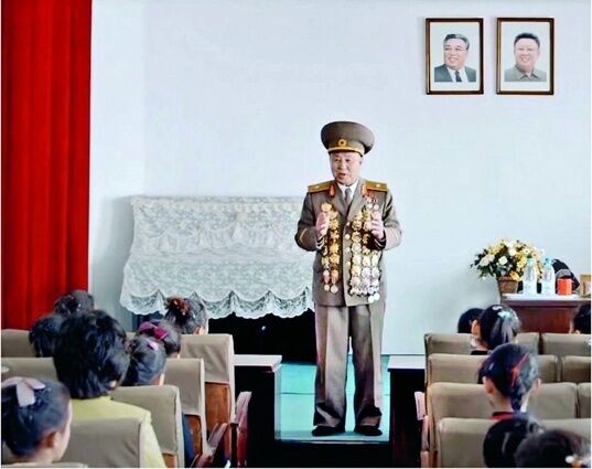 Зин учится в идеальной школе с образцовыми учительницами и отличницами-ученицами (в КНДР раздельное гендерное обучение), где время от времени проходят показательные уроки любви к вождям и ненависти к врагам. Эталонный в своем слабоумии ветеран неизвестно какой войны (последняя война закончилась в Корее 60 лет назад), звеня орденами, живописует отличницам, как сбивал пулеметами американские самолеты (этому его научил отважный вождь, который, хотя и находился непрестанно на передовой, успевал всех чему-то полезному научить), и больше всего напоминает артиста в дурной пьесе. Наворотив несусветной чуши о героическом вожде и трусливых американцах, ветеран вдруг останавливается, поворачивается и спрашивает у кого-то из съемочной группы: "Что я еще должен сказать?". – "Еще раз повторите". И он повторяет, смеясь в нужных местах над ничтожностью американцев, девочки зевают. Одна стоически борется со сном. Подавляет зевоту, вздрагивает, выпрямляется, но не позволяет себе уснуть даже на мгновенье.