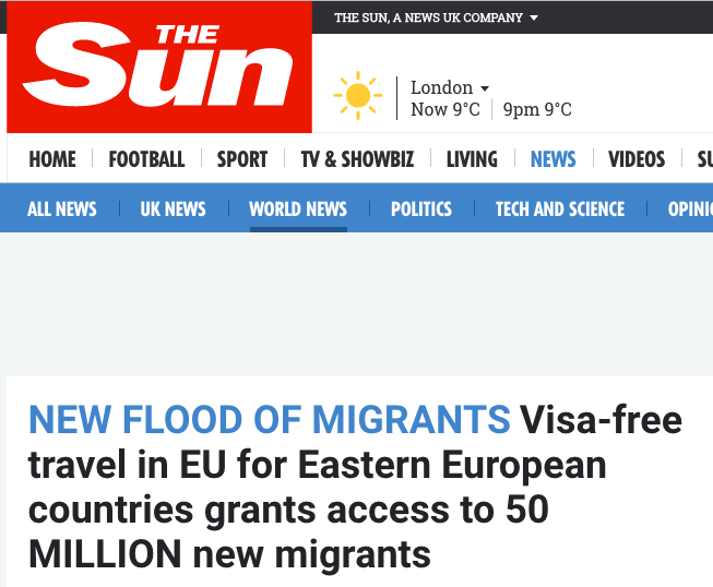 8 декабря, когда механизм приостановления безвизового режима был утвержден комитетом постоянных представителей стран в ЕС и направлен для голосования в Европарламент, европейские СМИ вышли с заголовками о том, что “ЕС достиг соглашения, необходимого для отмены виз 50 миллионам людей”. Это правильно фактически, но не совсем корректно с точки зрения текущей ситуации. Для безвизовых путешествий по Европе потребуется биометрический паспорт, а их в Украине за два года выдано только около 2,3 миллионов, сообщает "BBC Україна". Британский таблоид The Sun и вовсе вышел с заголовком о том, что ЕС гарантировал доступ 50 миллионам новых мигрантов.