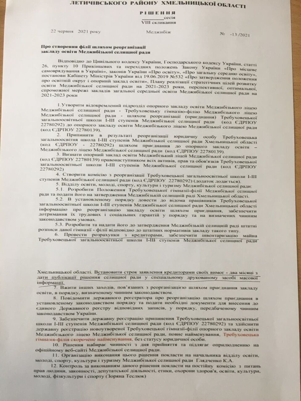 – Пока это все еще Требуховецкая общеобразовательная школа 1–3 степени. Но власти пытаются реорганизовать ее в филиал Меджибожского лицея. Уже есть проект решения Меджибожского сельского совета по этому вопросу, за который депутаты собираются голосовать 22 июня. Такие действия мало того что незаконные, они еще и нецелесообразные.