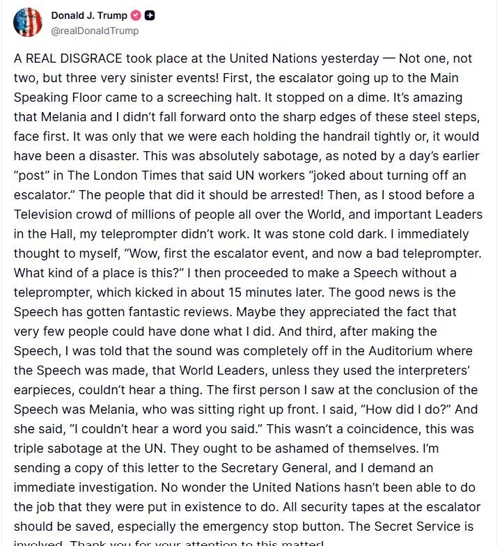 "Я отправляю копию этого письма генеральному секретарю и требую немедленного расследования. Неудивительно, что ООН не смогла выполнить свою миссию. Все записи с камер наблюдения с эскалатора, особенно с кнопкой аварийной остановки, должны быть сохранены. В дело уже вмешалась Секретная служба", – заявил Трамп.