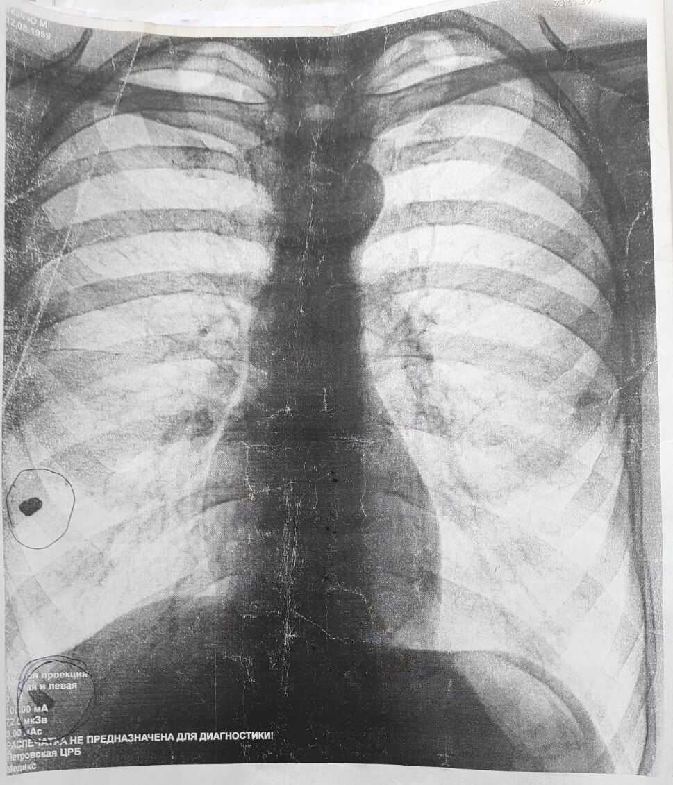 – Да. Из них два тяжелых. В 2010-м, 2013-м – насквозь в левую сторону груди, в 2014 году – тяжелое огнестрельное ранение. Мне не оказали помощь. Я пережил клиническую смерть и вытащили пулю, которая есть на снимке. На мои неоднократные обращения в прокуратуру – в областную, в райотдел, к следователям – до сих пор мне не предоставили направление на судебно-медицинскую экспертизу. Мне все отказывают.